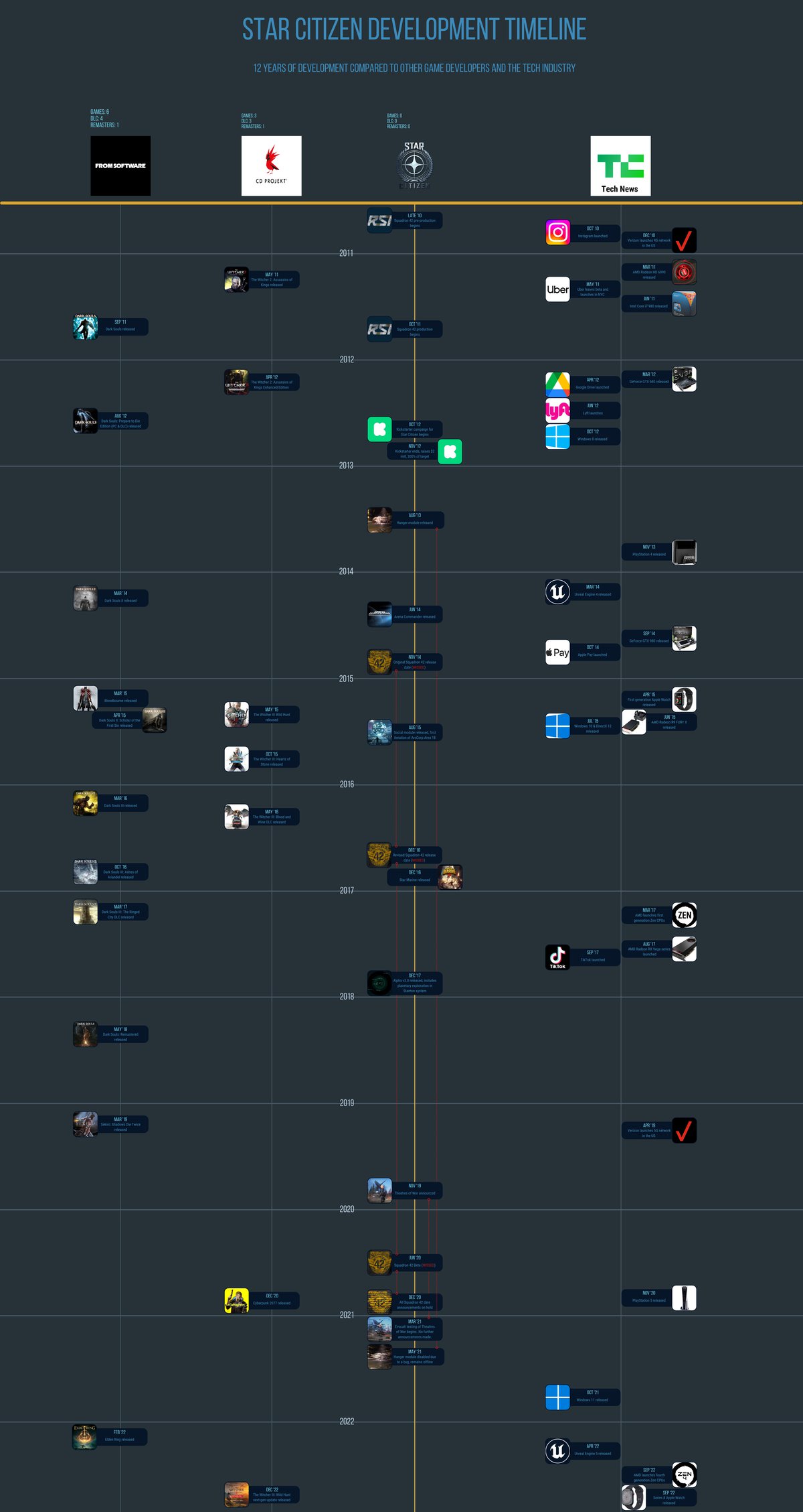Чтобы показать, что произошло за время разработки Star Citizen, участники игрового сабреддита создали довольно длинную инфографику. Непосредственными конкурентами разработчиков стали From Software и CD Projekt RED; кроме того, на инфографику попали крупные технологические новости.