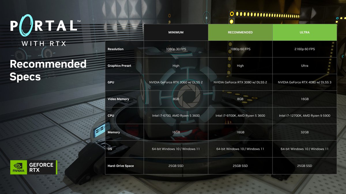 Nvidia распространила системные требования Portal RTX, улучшенной версии оригинальной игры с доработанной графикой. Игрокам понадобится чрезвычайно мощная система, чтобы получить 60 кадров в секунду в разрешении 4К.