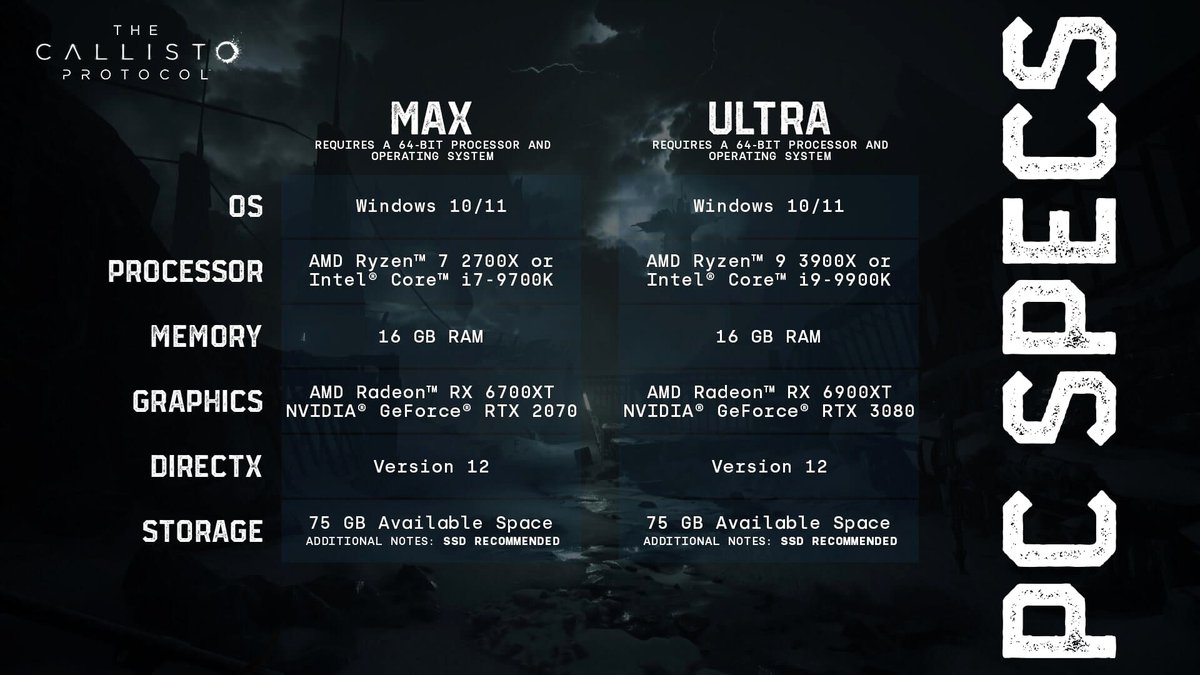 За несколько часов до выпуска хоррора The Callisto Protocol разработчики игры опубликовали полные системные требования. Прежде у нас были только минимальная и рекомендуемая конфигурации, теперь появились максимальная и ультра.