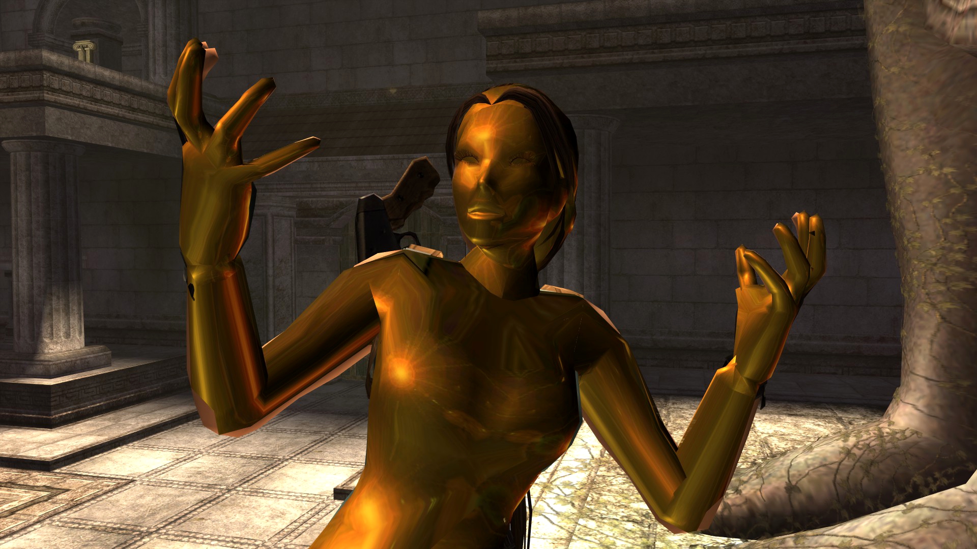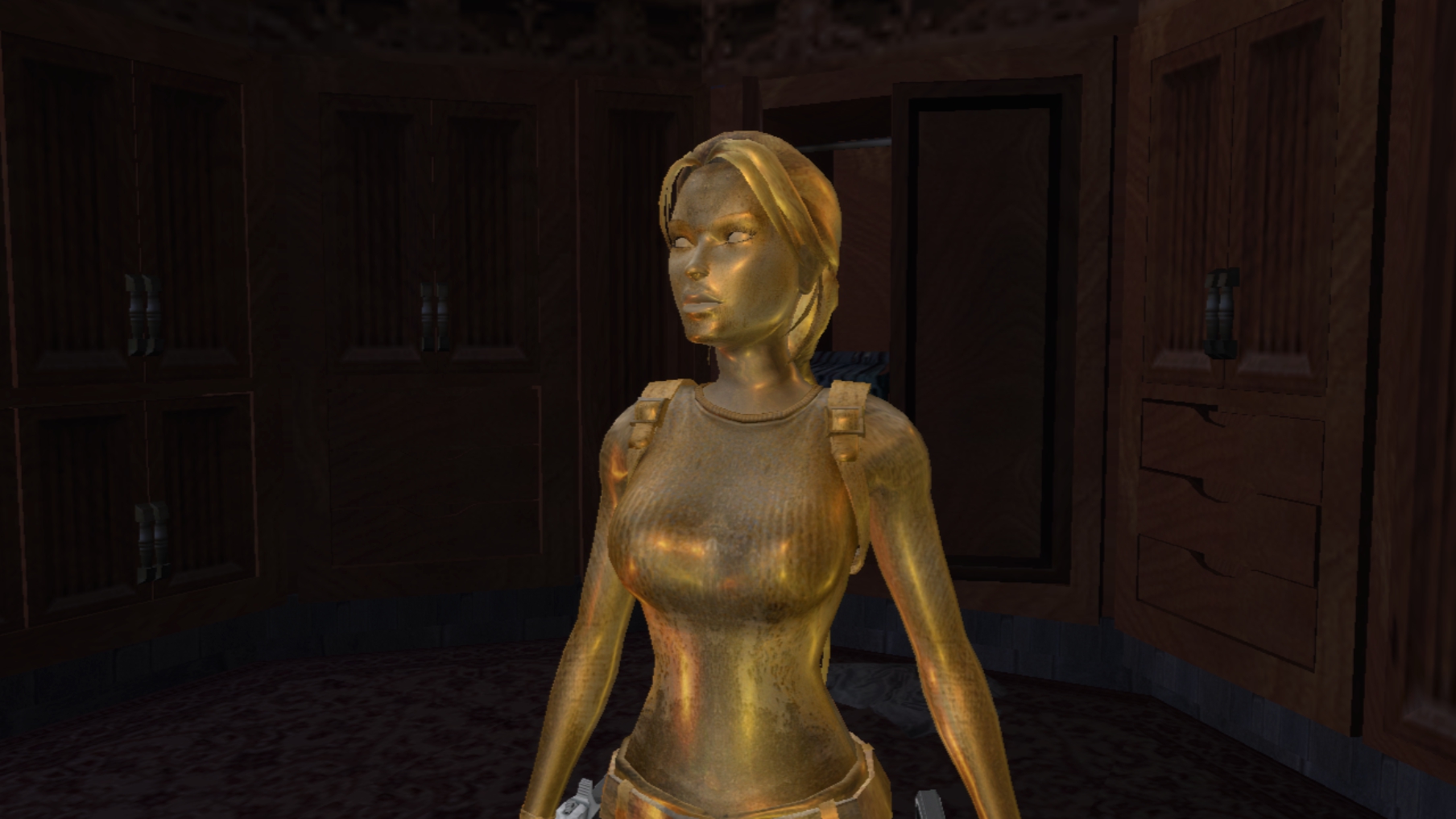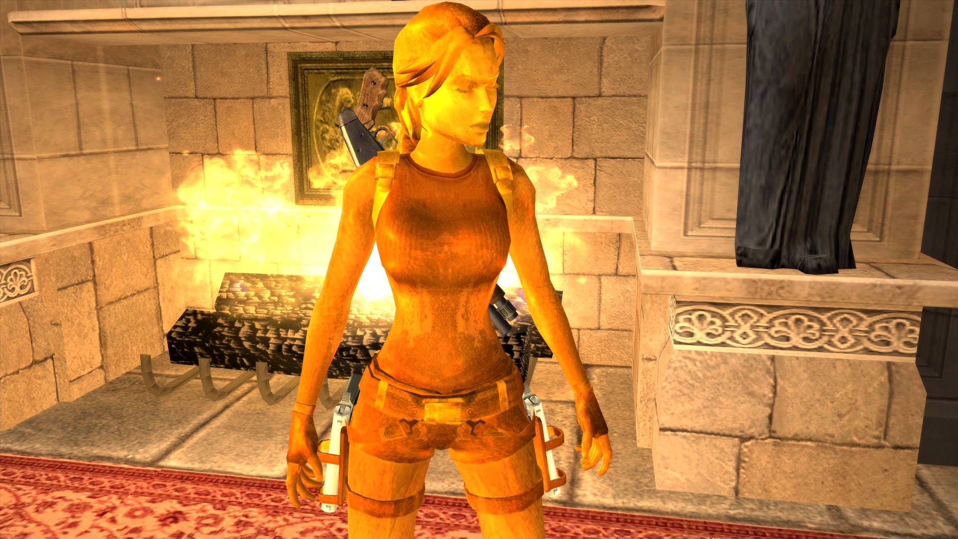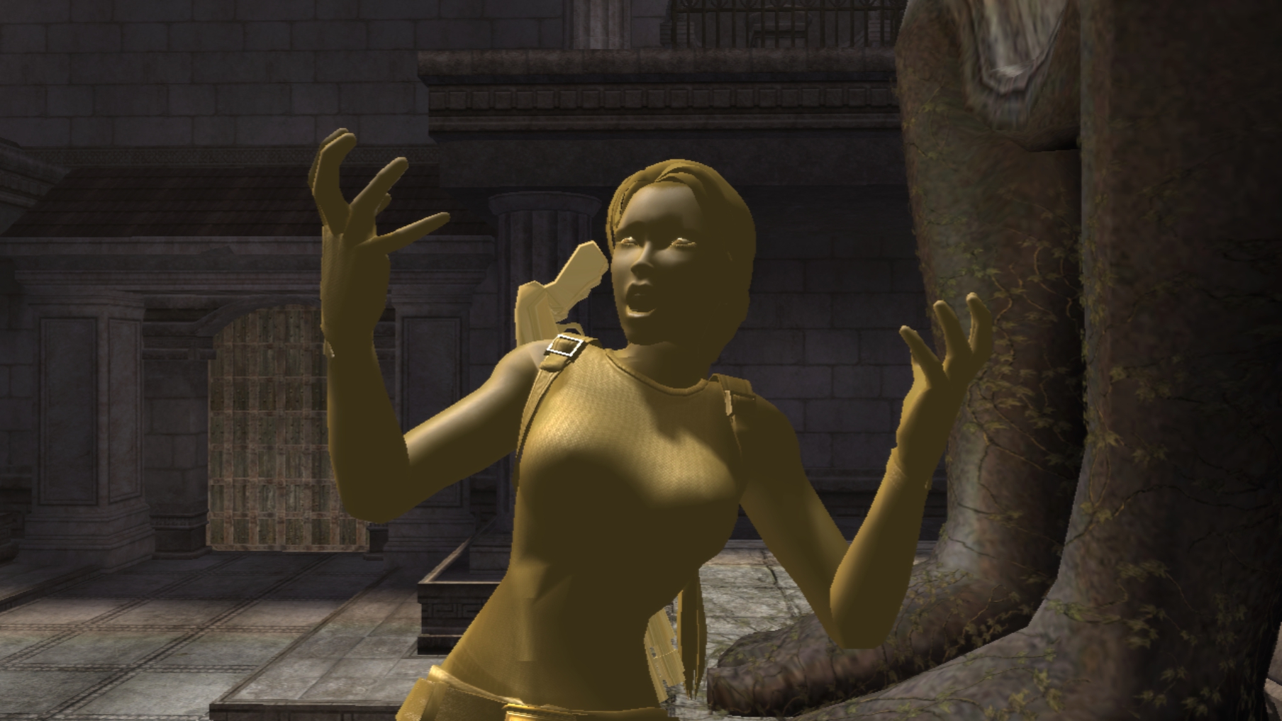 1. Золотая Лара, вставшая на руку Мидаса. На сей раз нет никаких отражений на Ларе, выглядит так, будто Лара лишается текстур и окрашивается в желтые полигоны. В сравнении с этим даже PC версия выглядит адекватно, а лучшей версией осталась PSP.