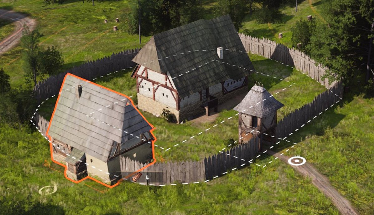 Вот так сейчас выглядит новый прототип укрепленного замка первого уровня: базовая усадьба и забор вокруг нее. Есть проблема — свободной земли вокруг основного здания мало, добавить новое строение не получится.