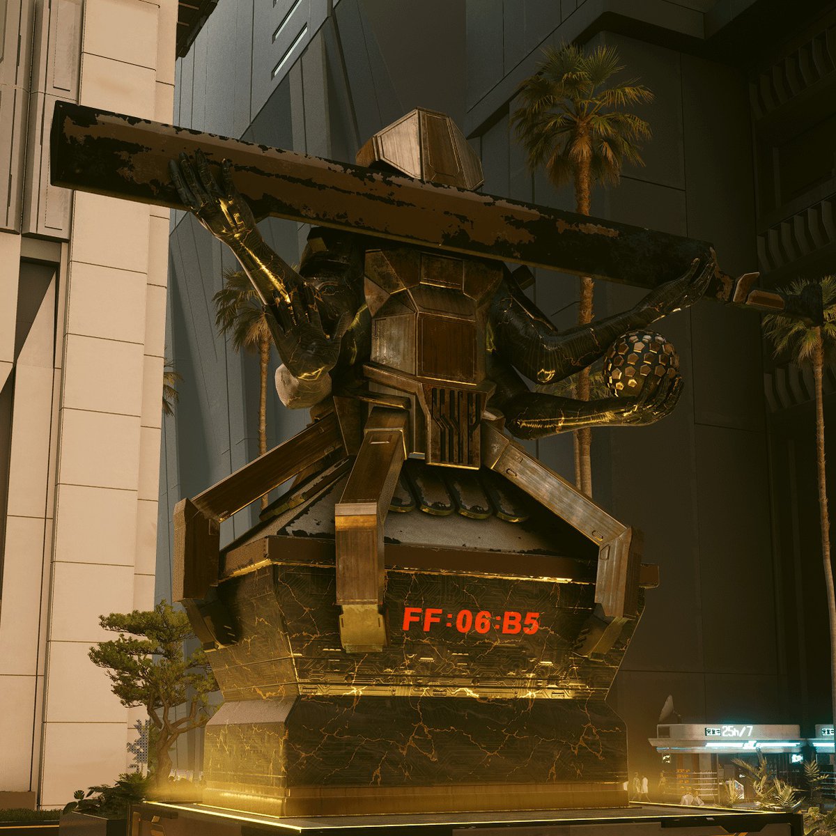 Если перевести символы, написанные на стене, то окажется, что там написано FF:06:B5. Такая же надпись есть на статуе в Cyberpunk 2077. Рисунок в центре треугольника тоже повторяет рисунок на статуе.