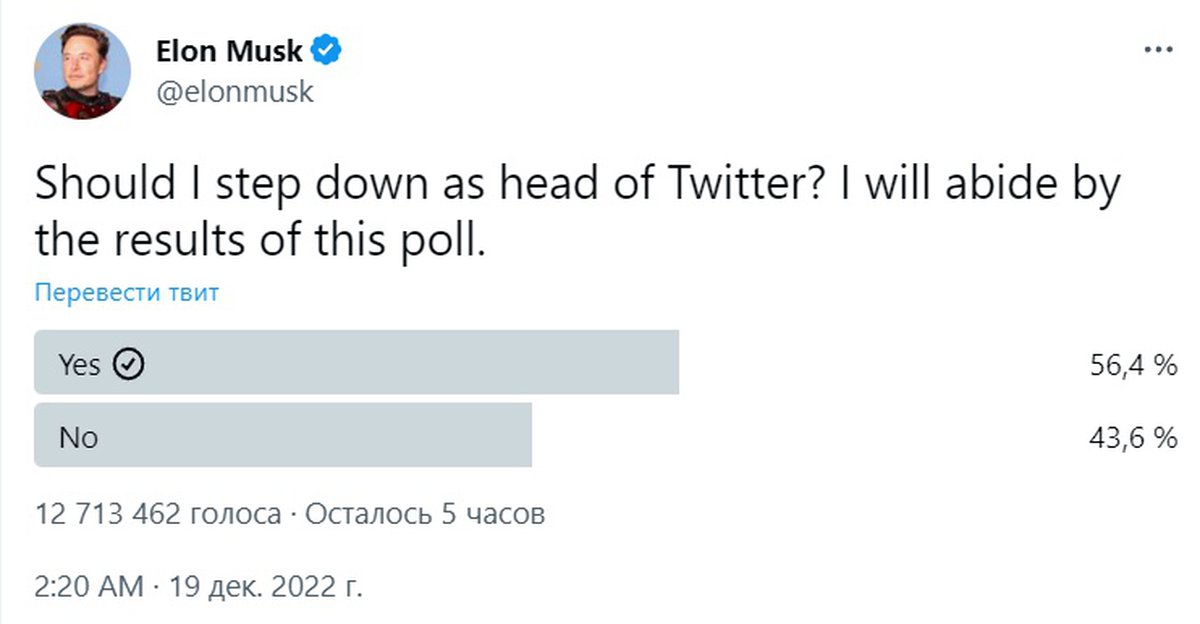 Миллиардер Илон Маск, купивший социальную сеть Twitter, запустил в ней опрос: он интересуется, нужно ли ему и дальше руководить работой сети. По состоянию на утро 19 декабря в опросе поучаствовало больше 12 миллионов пользователей.