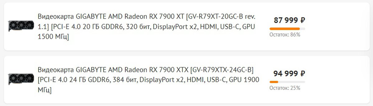 Младшую Radeon RX 7900 XT оценили в 87999 рублей, старшую Radeon RX 7900 XTX продают за 94999 рублей. Быстрее всего раскупили именно старшие карты.