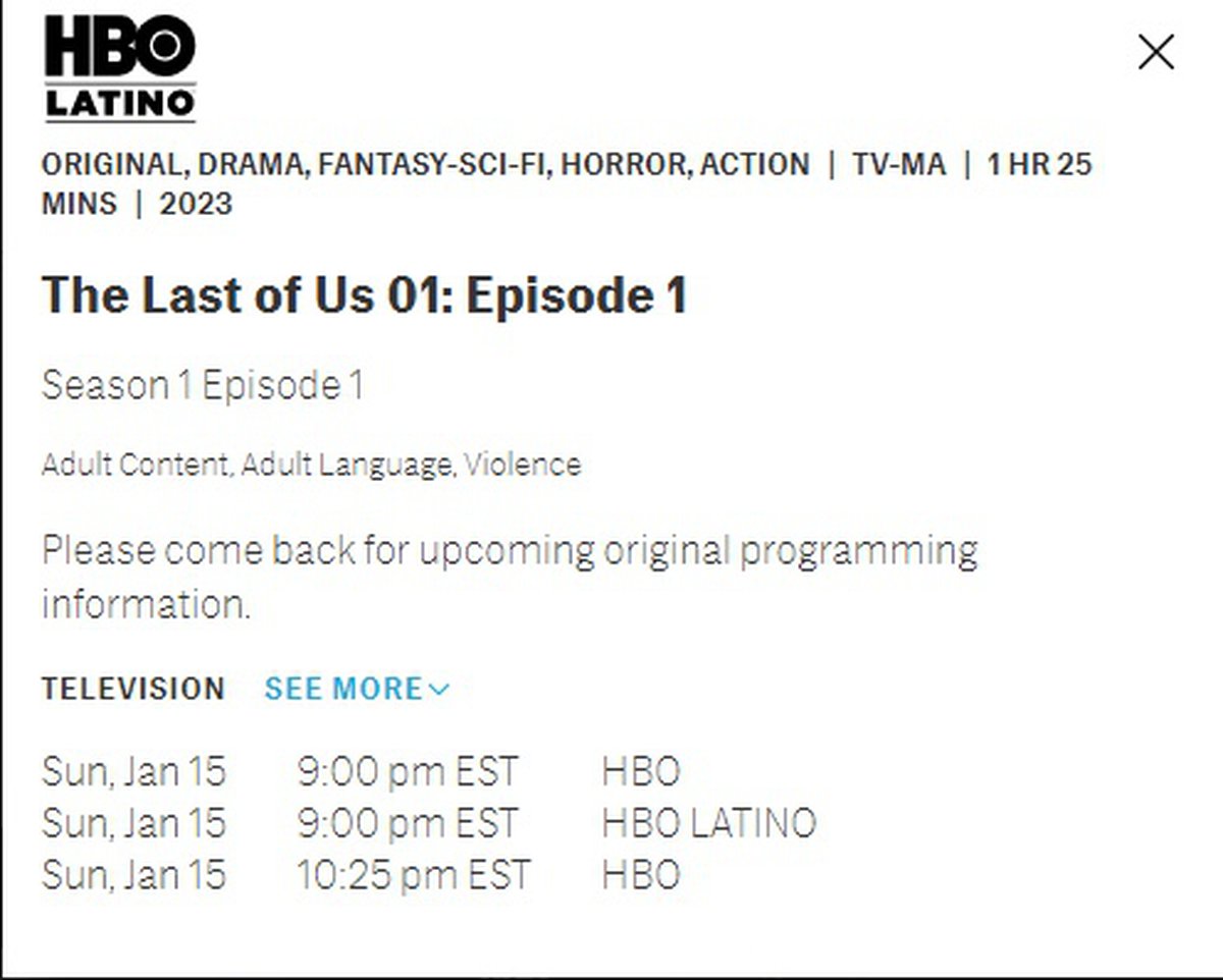 Премьерный эпизод сериала The Last of Us идет 85 минут, следует из расписания канала HBO. Не вполне ясно, планируются ли у эпизода рекламные вставки или это чистое время показа.
