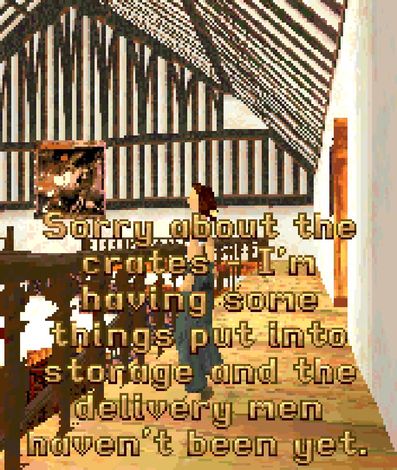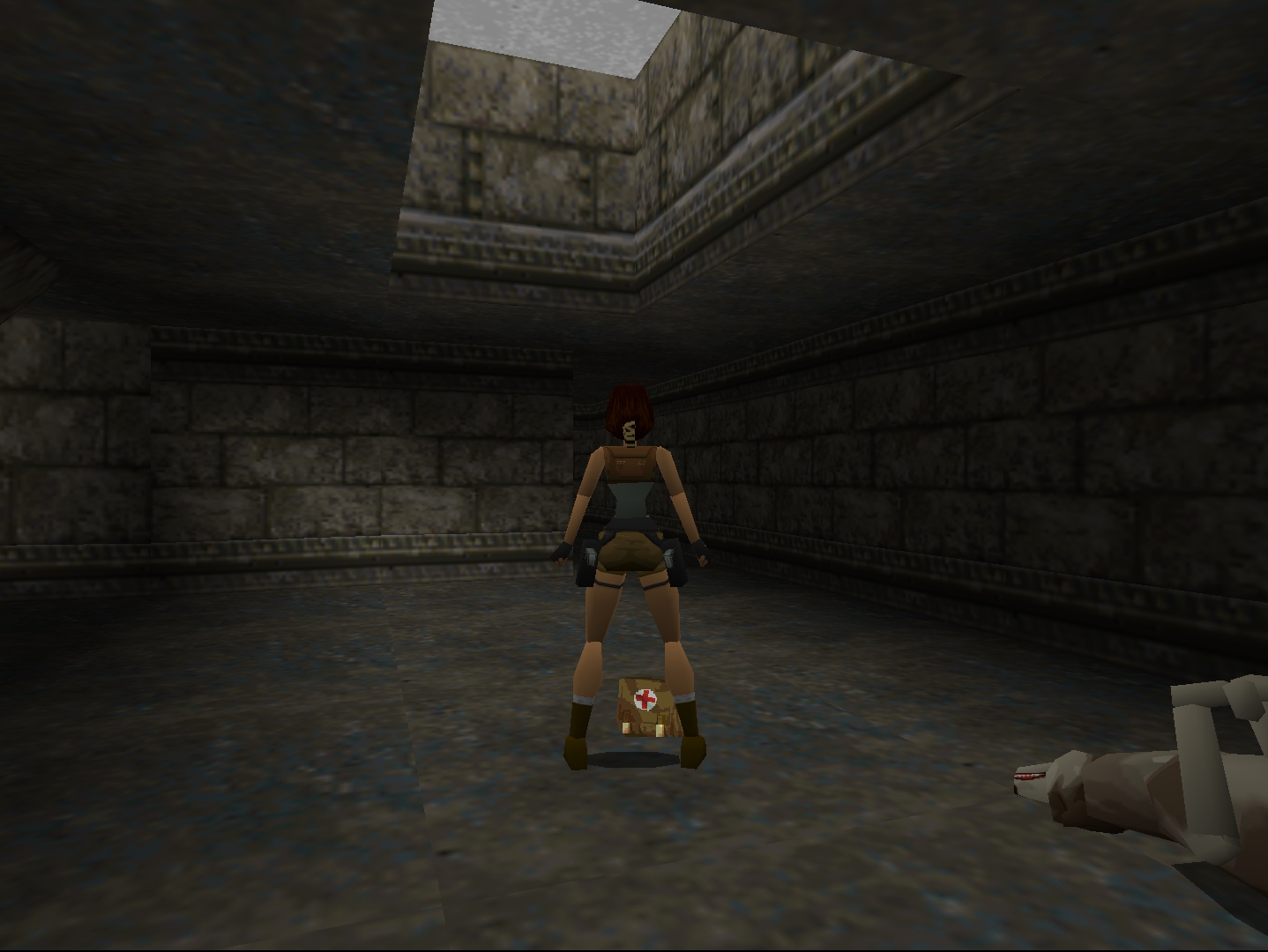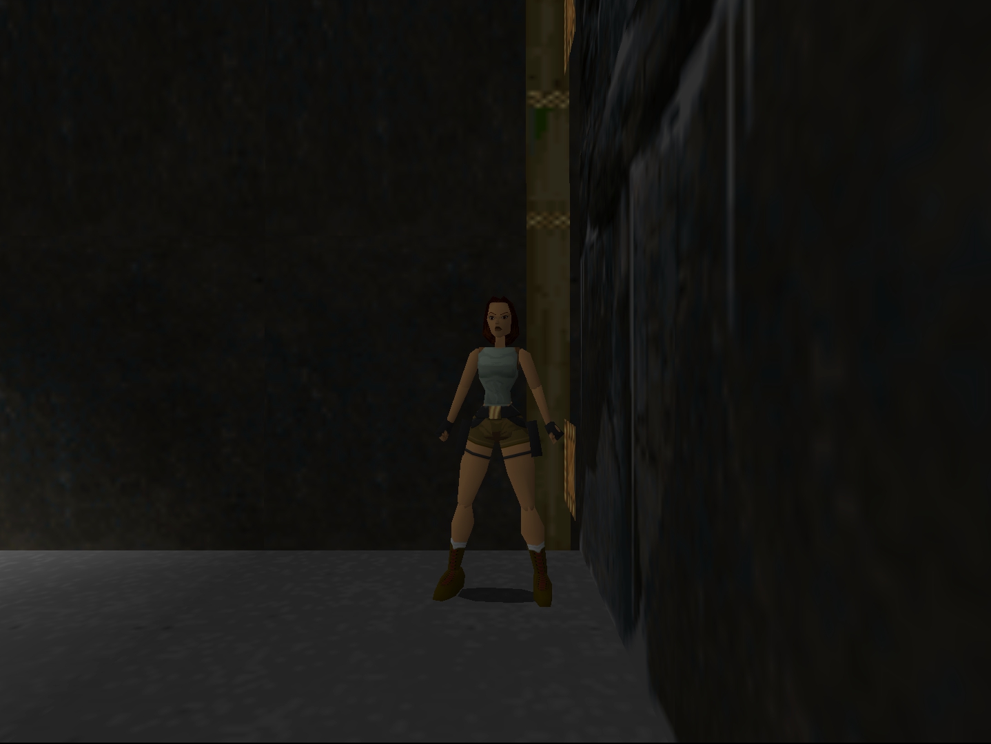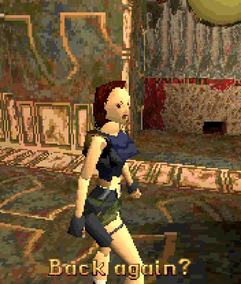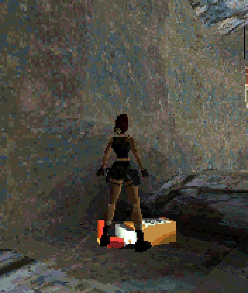 Однако, вернёмся к тому, что Лару образца 1996 года, заменили на Лару из 2003 года. Дело в том, что в самой игре Лару изменили, подгоняли цветовую палитру костюма под ту, что фигурировала на рендере в главном меню. В роликах, к слову, это дело также правили и где Лара мелькает – там её костюм перерисовали.