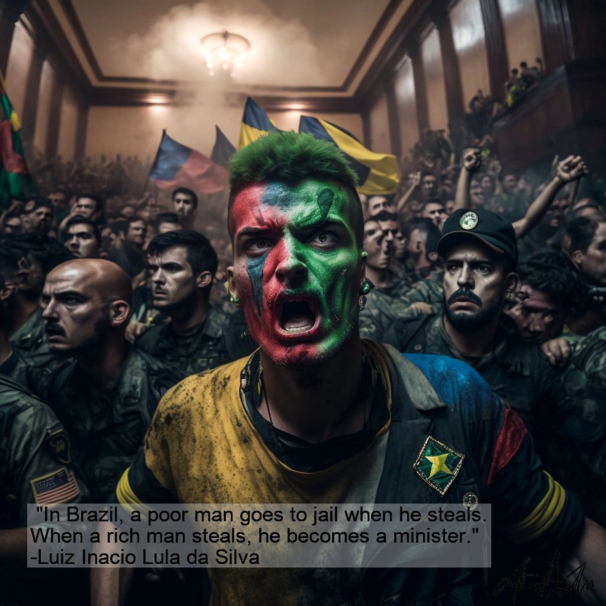 А вот таким артом ИИ проиллюстрировал новость о том, что в Бразилии протестующие проникли в здания Верховного суда и Конгресса.