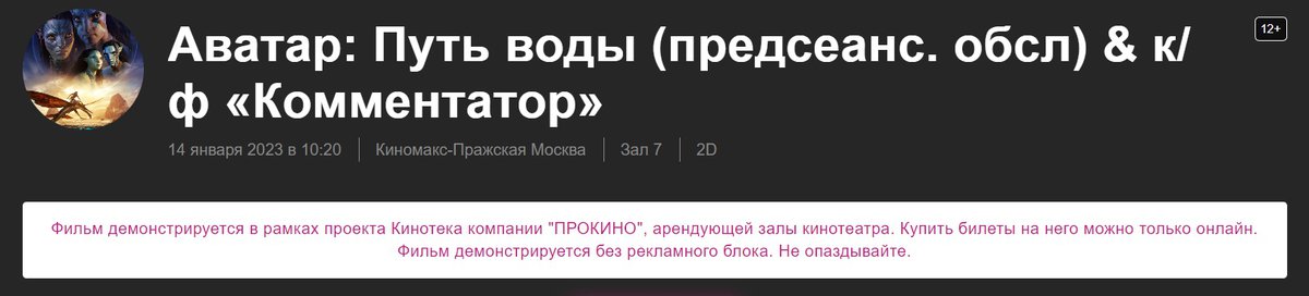 Крупные российские сети кинотеатров начали показывать фильм «Аватар: Путь воды», официально не выпускавшийся в прокат на местном рынке. На сайтах киносетей сеансы «Аватара 2» начали массово появляться с 12 января.