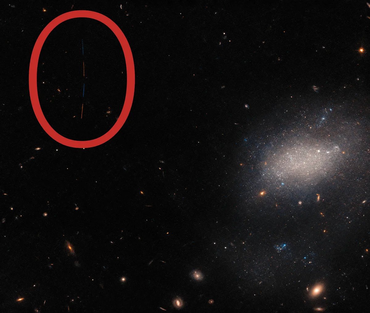 Телескоп «Хаббл», снимавший галактику UGC 7983, зафиксировал достаточно редкое явление. На снимке «Хаббла» обнаружили «фотобомбу», оставленную астероидом, пролетавшим перед камерой во время съемок.