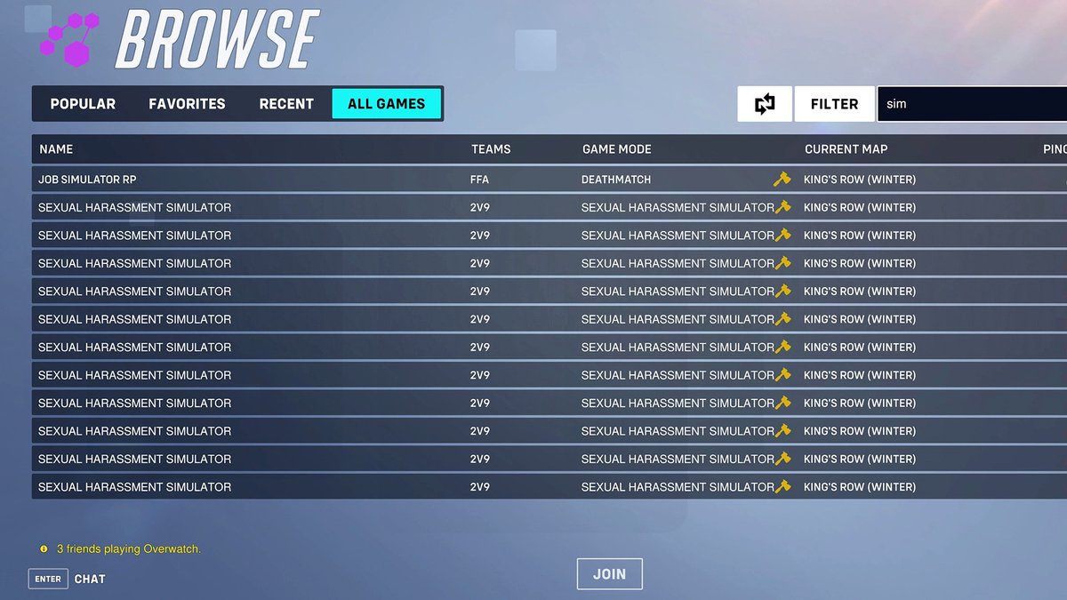 В Overwatch как минимум с января 2022 года существует пользовательский режим «симулятор сексуального насилия». На протяжении года игроки регулярно на него жалуются, но пока Blizzard не удалось победить этот режим.