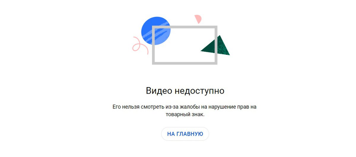 Теперь при попытке открыть видео YouTube сообщает, что ролики удалены из-за жалобы на нарушение прав на товарный знак.
