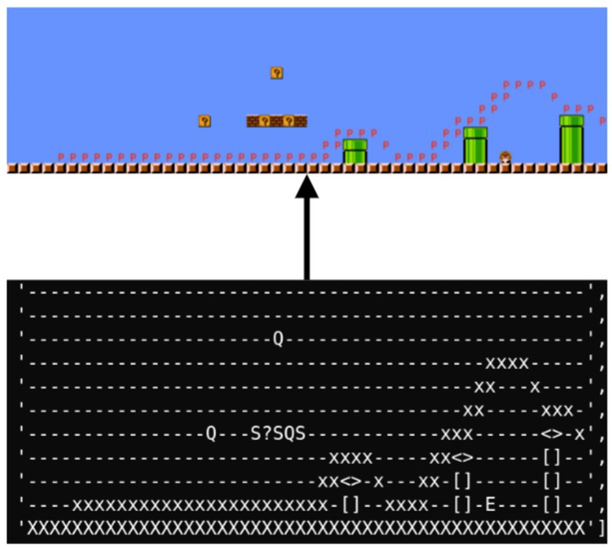 Примечателен процесс обучения нейросети. Для создания датасета исследователям пришлось визуализировать локации Super Mario Bros. в тестовом формате — в результате уровни выглядели примерно так.