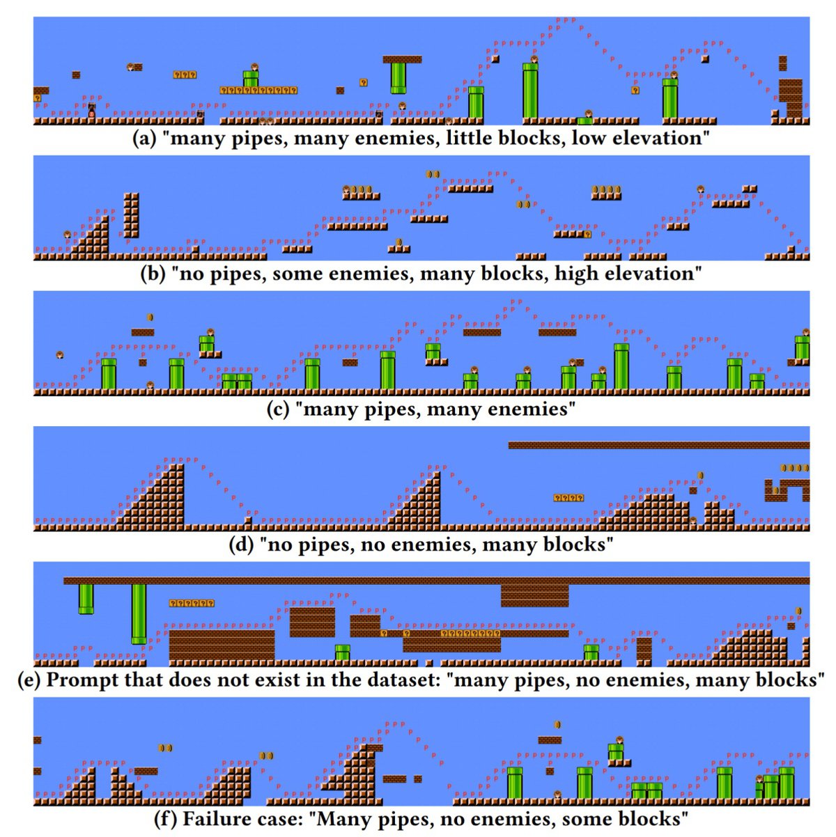 После обучения на «текстовых» версиях уровней нейросеть оказалась способна генерировать локации по очень простым описаниям: например, «много блоков, нет труб, нет врагов».