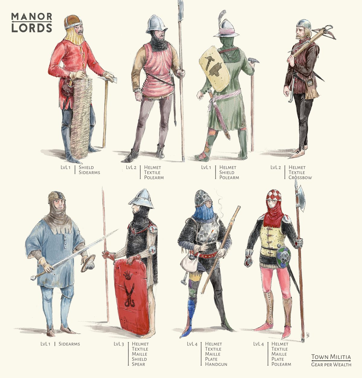 Художник Eol, участвующий в разработке средневековой стратегии Manor Lords, показал несколько концептов с уровнями бойцов городского ополчения. По мере прокачки внешность бойцов будет меняться.