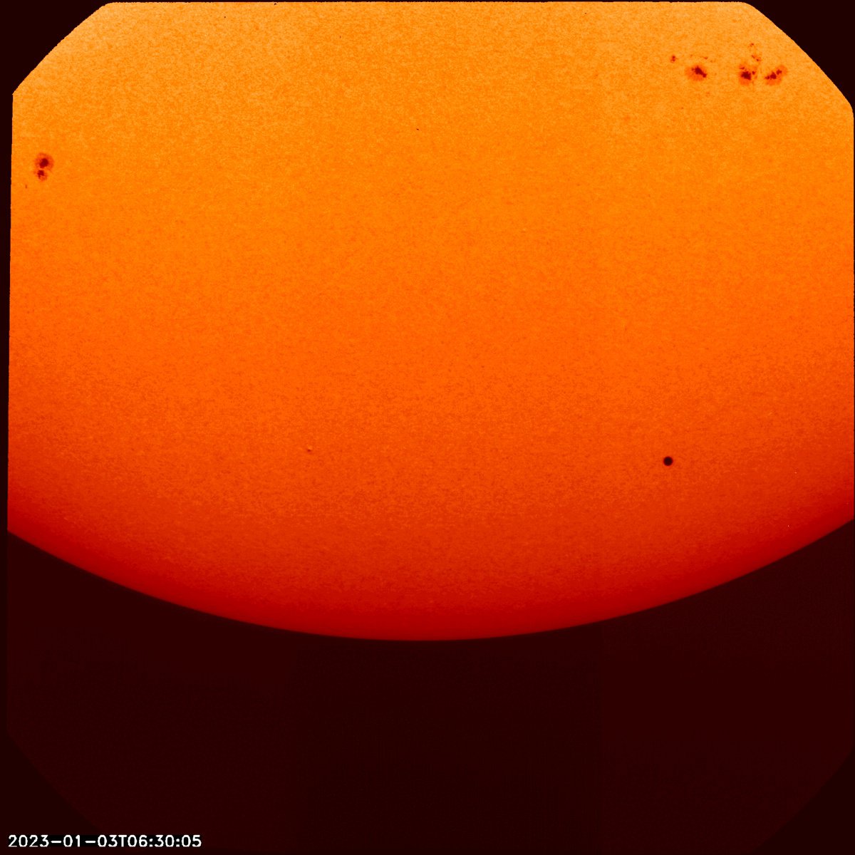 На кадрах, опубликованных командой Solar Orbiter, Меркурий это маленький темный диск, заметный на фоне одного из сегментов Солнца. По размеру Меркурий сопоставим с одним из солнечных пятен.