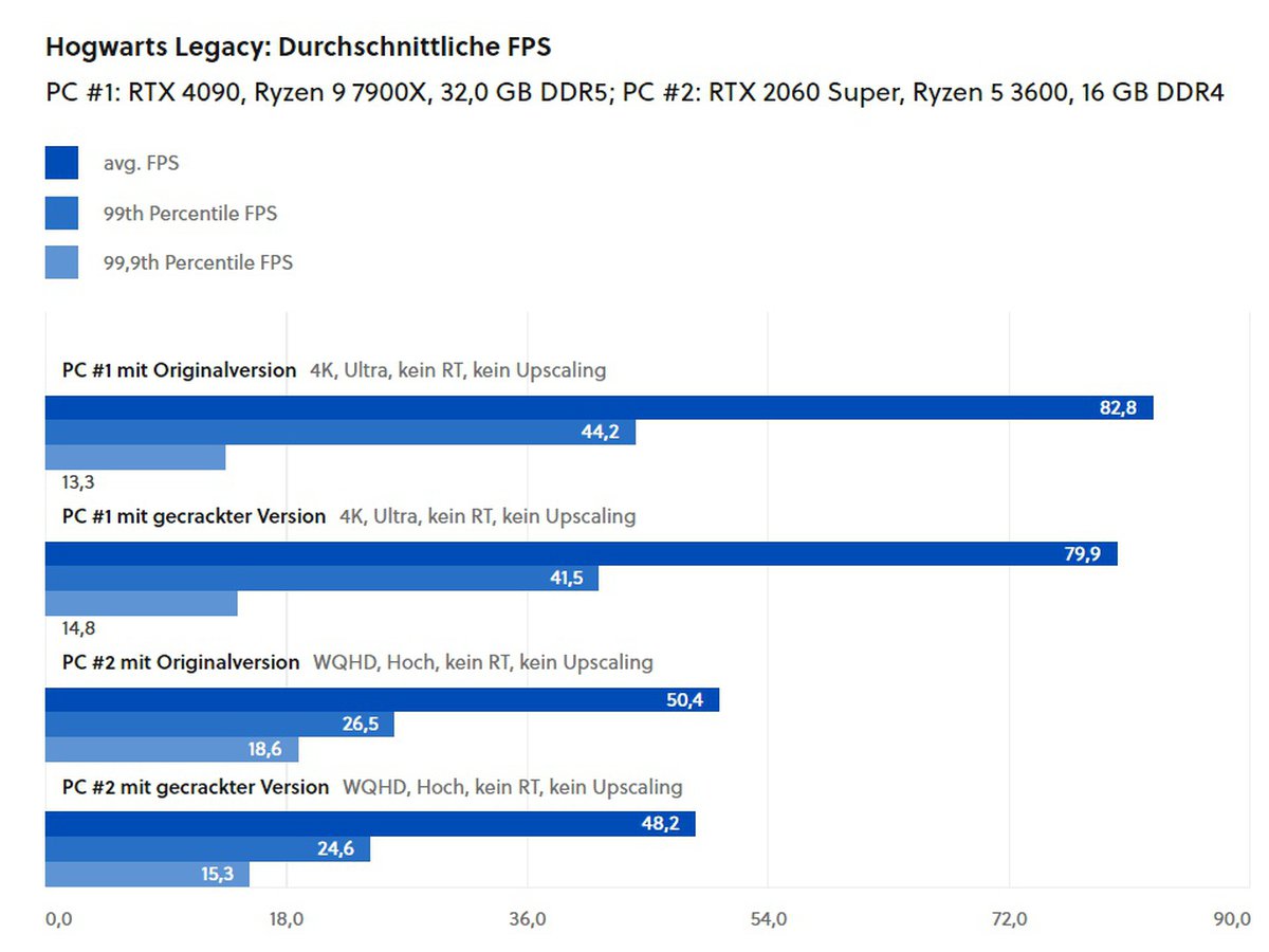 Согласно дополнительным тестам, частота кадров в оригинальной Hogwarts Legacy и взломанной версии более-менее равна, если в игре отключен оверлей. С включенным оверлеем лицензионная версия работает медленнее.