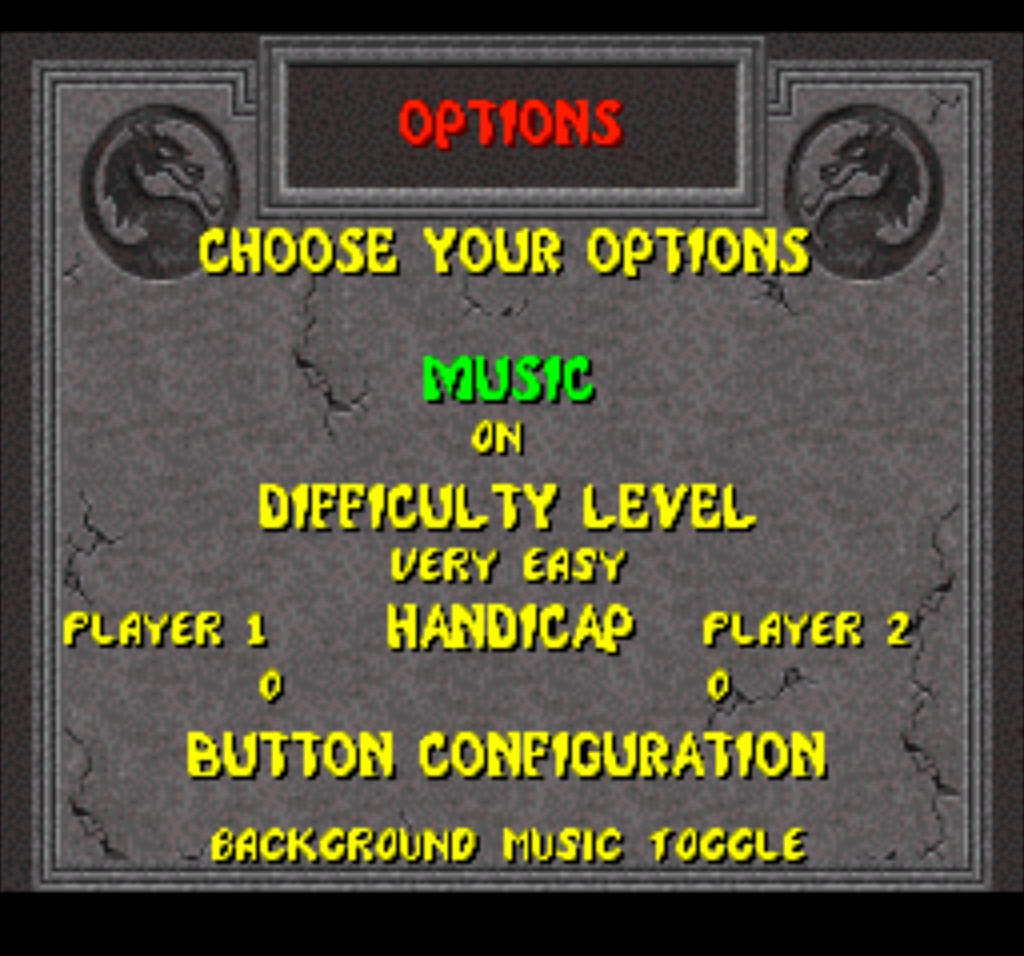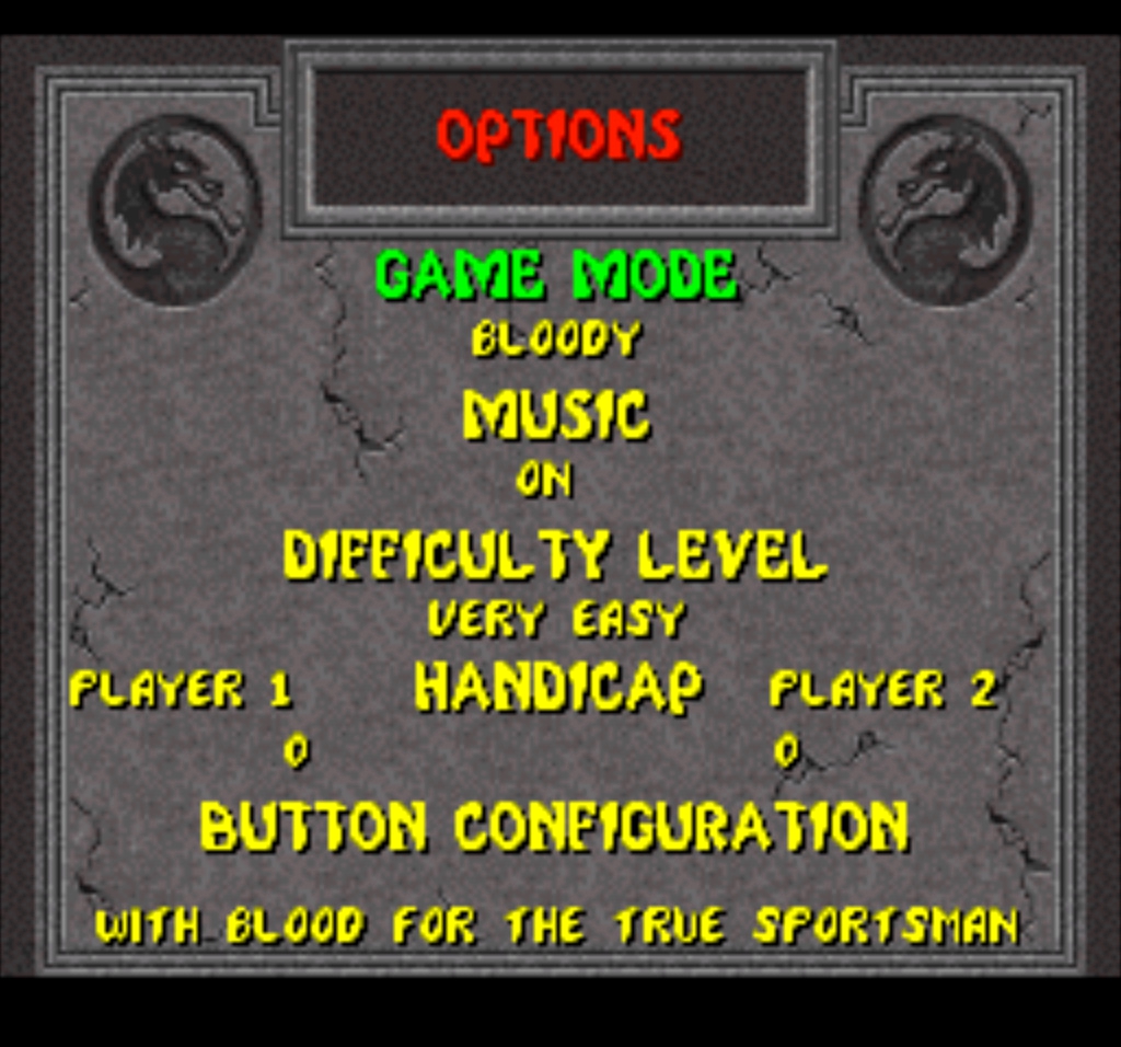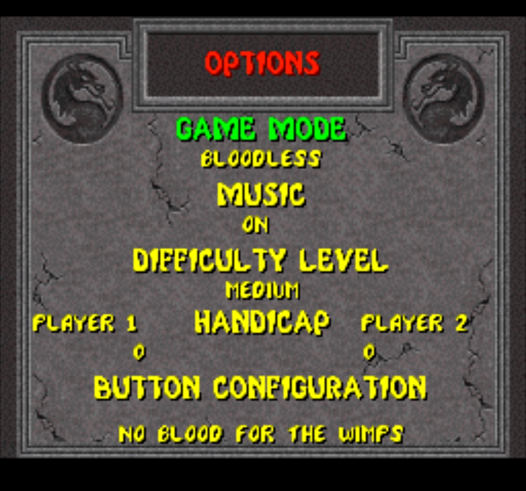 Зайдя в опции, в прототипе присутствует пункт, вырезанный из финальной версии – кровь. Достаточно странное решение вырезать дополнительную опцию, ведь это повысит возрастной рейтинг игры. Да и в целом, первая часть для Super Nintendo прославилась тем, что в ней нет крови совсем, когда как у консолей Sega для этого был введён чит.код. С чего вдруг для Nintendo вышла версия без цензуры? Увы, сказать не могу.