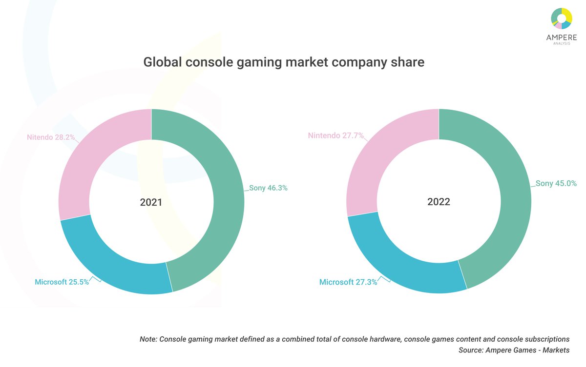 По данным Ampere Analysis, в 2022 году игровому подразделению Microsoft удалось нарастить долю рынка с 25.5% до 27.3%. Одновременно доля Sony сократилась с 46.3% до 45%, а доля Nintendo упала с 28.2% до 27.7%.