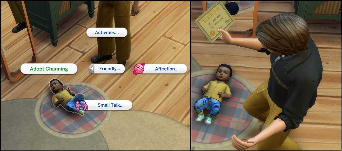 В нынешней версии The Sims 4 усыновление тоже есть, но механика выглядит иначе: игроку предлагается набор случайно сгенерированных детей-симов, а не уже существующий ребенок.