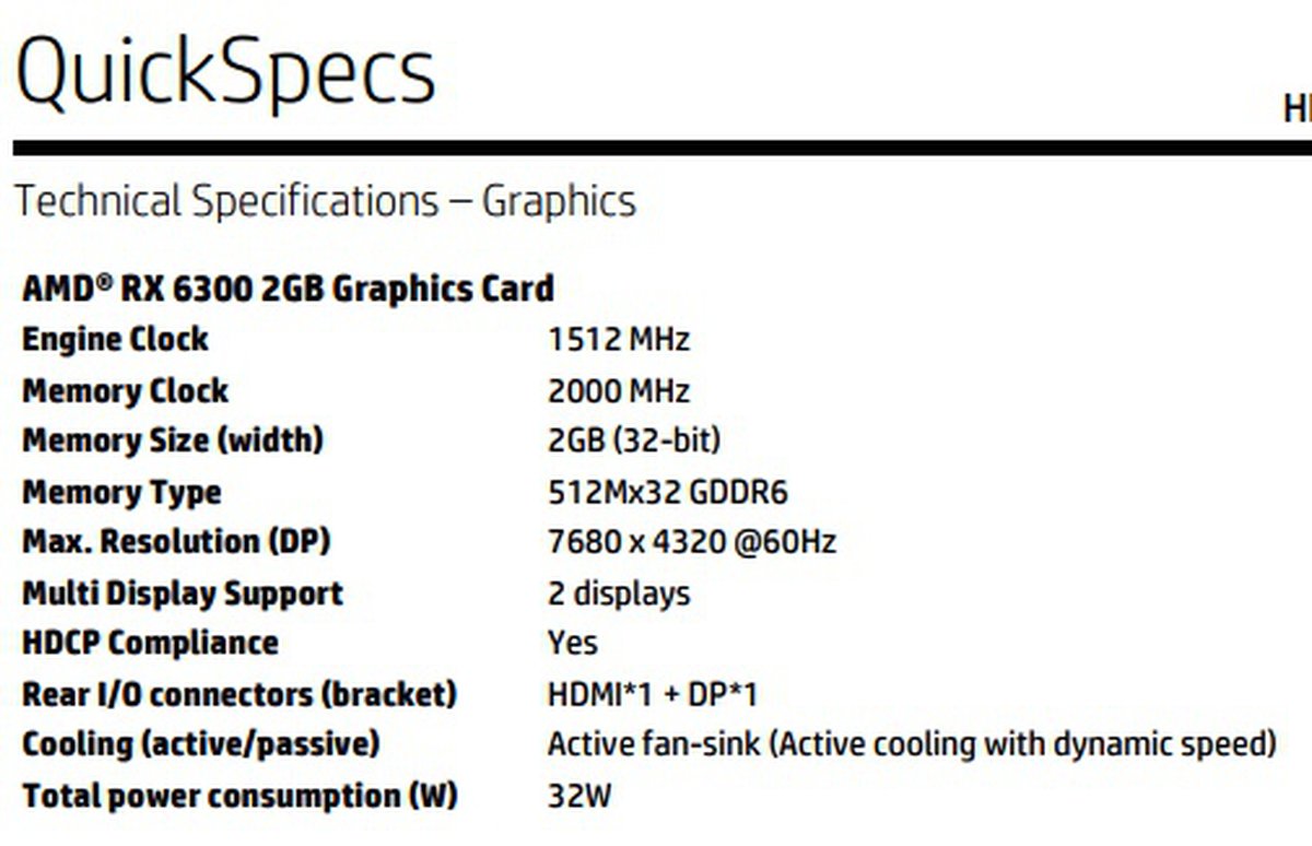 Устройство представляет собой урезанную версию видеокарты Radeon RX 6400, и без того не отличавшейся особенной производительностью. У Radeon RX 6300 2 гигабайта памяти GDDR6 и 32-битная шина памяти. Энергопотребление карты равно 32 Вт.