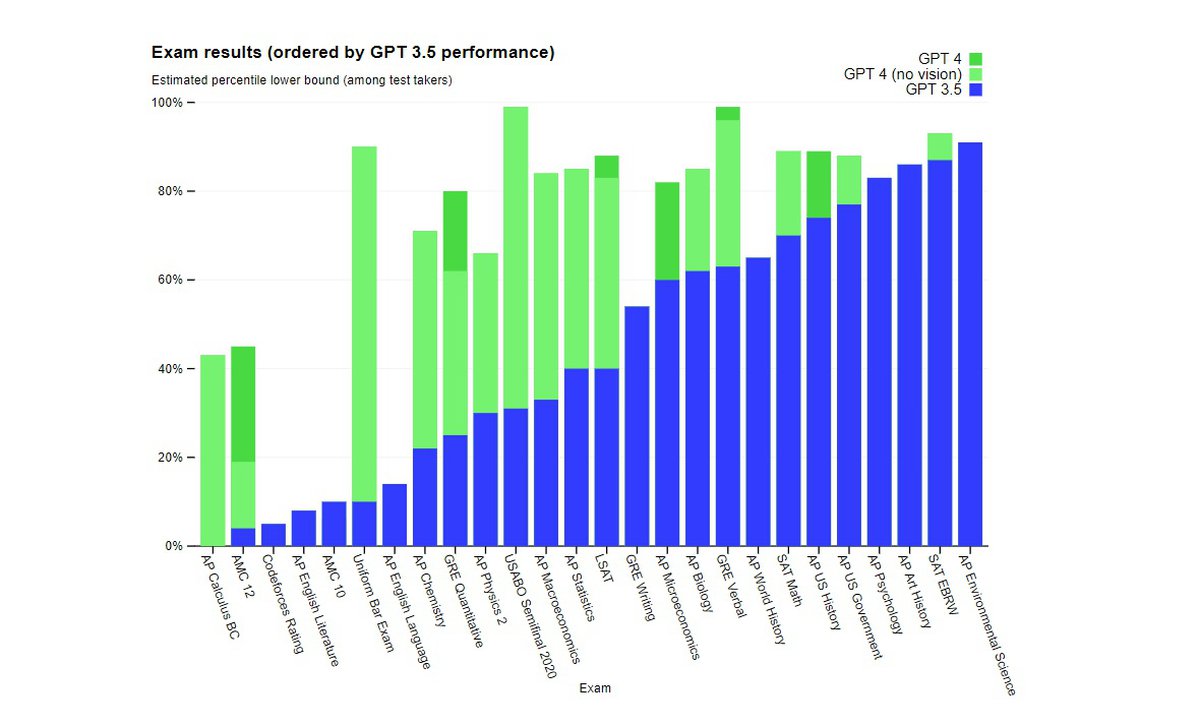 В частности, GPT-4 удалось сдать несколько экзаменов (Uniform Bar, LSAT, GRE) с результатом, попавшим в топ-10 лучших результатов конкурсантов-людей. Для сравнения: в тех же тестах GPT-3.5 была среди худших 10% результатов.