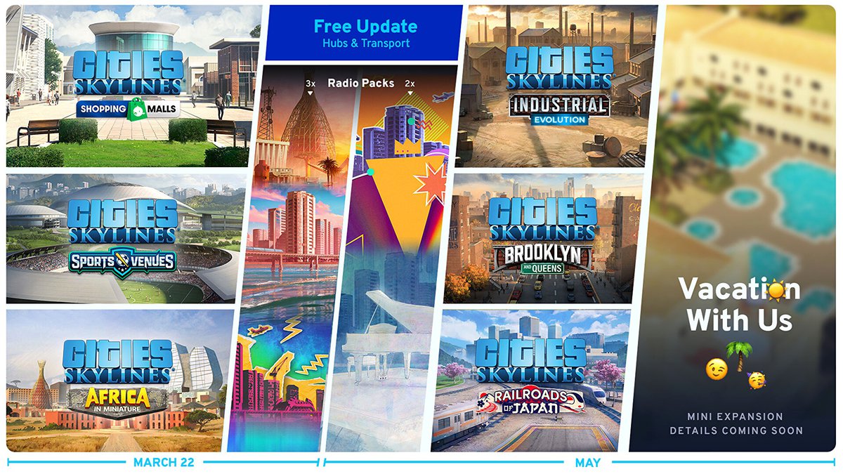 Первое из таких DLC будет выпущено уже 22 марта: игроки получат три радиостанции, а также наборы Africa in Miniature, Sports Venues и Shopping Malls. Затем выйдет бесплатное обновление Hubs and Transport; оно появится в апреле или мае.