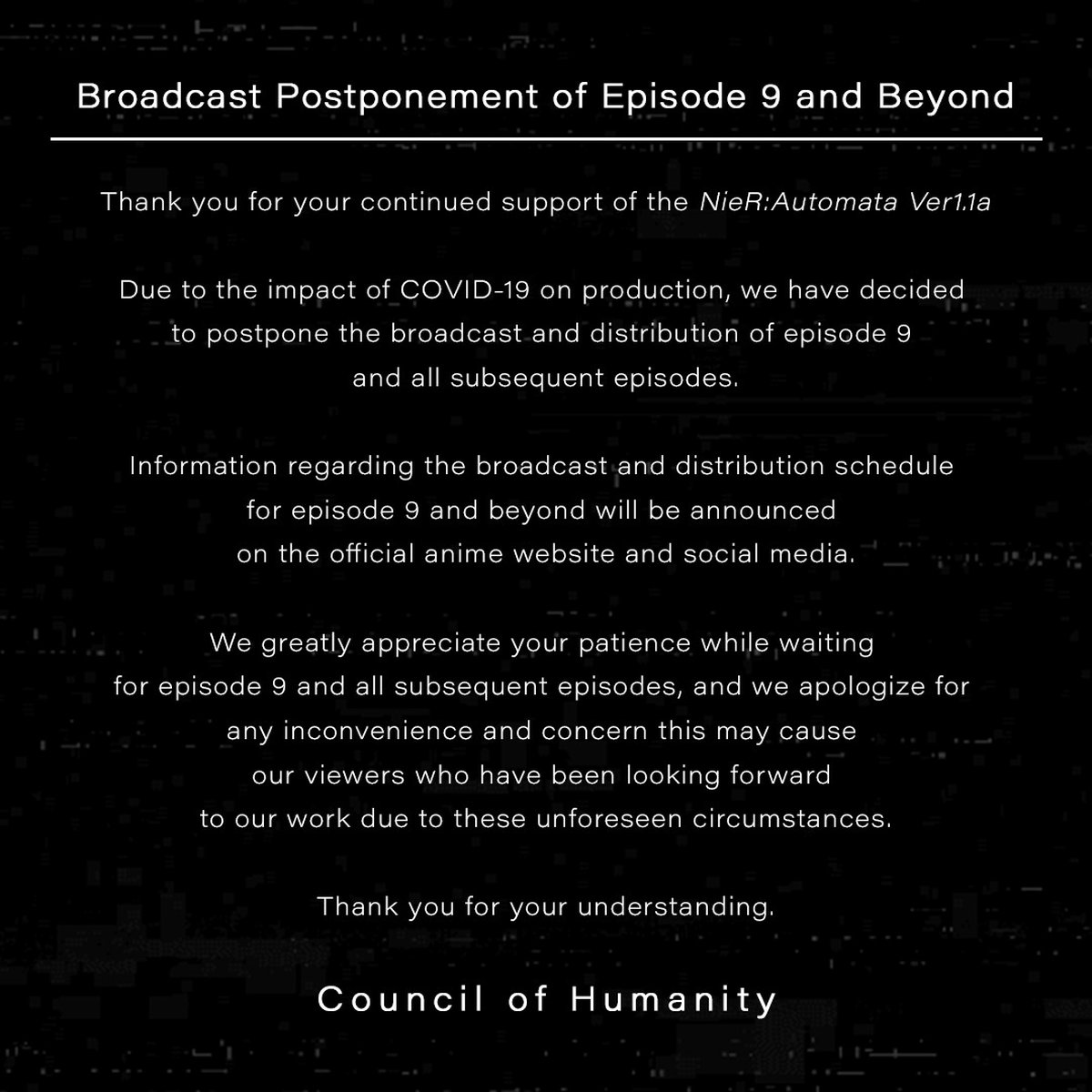 Задержать выпуск эпизодов пришлось из-за влияния пандемии COVID-19 на производственные процессы. Создатели NieR Automata Ver 1.1a извинились перед фанатами, но не сообщили, когда будет названа новая дата выхода 9 серии.