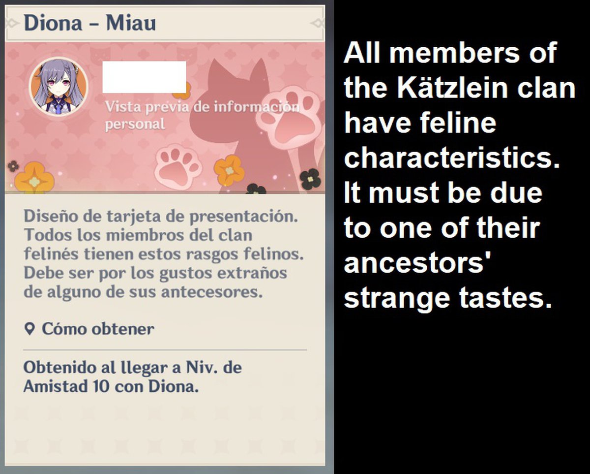 Например, испанская локализация Genshin Impact сообщает, что члены клана Дионы обязаны своим внешним видом «странным вкусам» кого-то из предков. Очевидно, заключают фанаты, один из предков Дионы переспал с кошкой.
