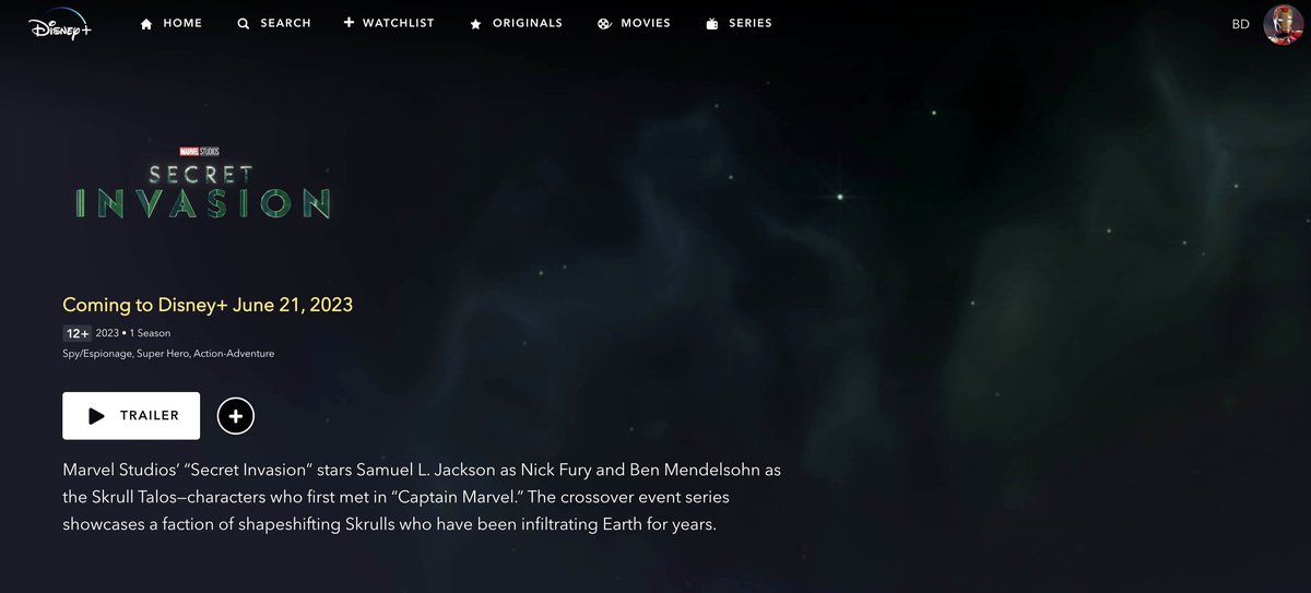 В сервисе Disney Plus появилась дата премьеры сериала «Секретное вторжение»: новый проект Marvel якобы начнет выходить 21 июня. Полное расписание выпуска эпизодов пока недоступно.