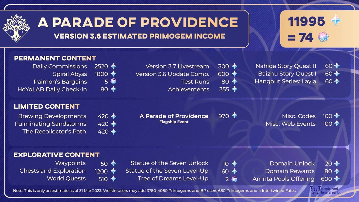В Wangsheng Funeral Parlor подсчитали количество Камней Истока, которые игроки в Genshin Impact смогут получить в обновлении 3.6. По приблизительной оценке, игроки могут рассчитывать на 11995 примогемов.