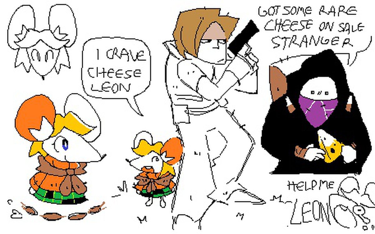 Похоже, все началось с художника (или художницы) Mora: еще в конце марта этот твиттер-аккаунт опубликовал схематичный рисунок, на котором Леон защищал не дочь президента, а мышку в юбочке. Эшли-мышка оказалась любительницей сыра — к счастью, он нашелся у Торговца.