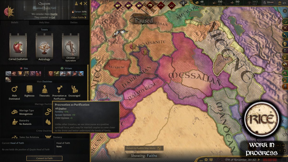 Дуалистические веры получили новую доктрину - очищение через размножение. В основной игре на старте этой доктрины не будет ни у кого, но, если поставить мод The Fallen Eagle и начать игру в 361 году, то она будет у кукистов.