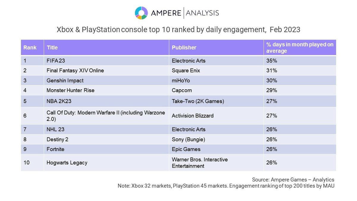 Также аналитики составили перечень игр, пользующихся наибольшей популярностью у владельцев консолей. В топ попали FIFA 23, Final Fantasy XIV и Genshin Impact, следом с небольшим отрывом идет Monster Hunter Rise.