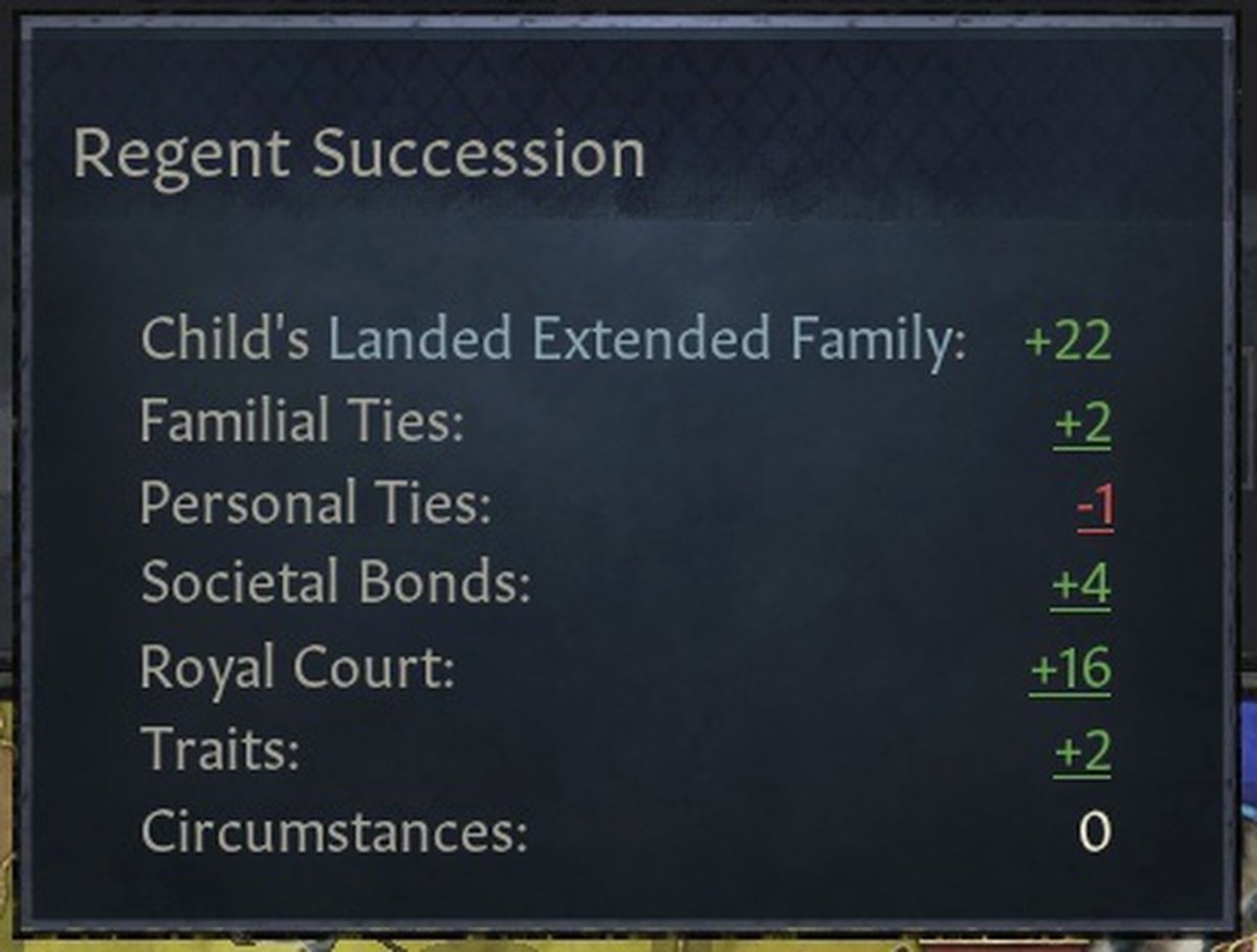 Будет специальный показатель, который подскажет наиболее подходящую кандидатуру. Тут учитываются многие вещи: семейные и социальные связи, умение говорить на языке двора, соответствие навыками типа двора, какие-то черты и т.д. Если правитель умрёт, а наследник молод, именно этот показатель определит, кто станет регентом.
