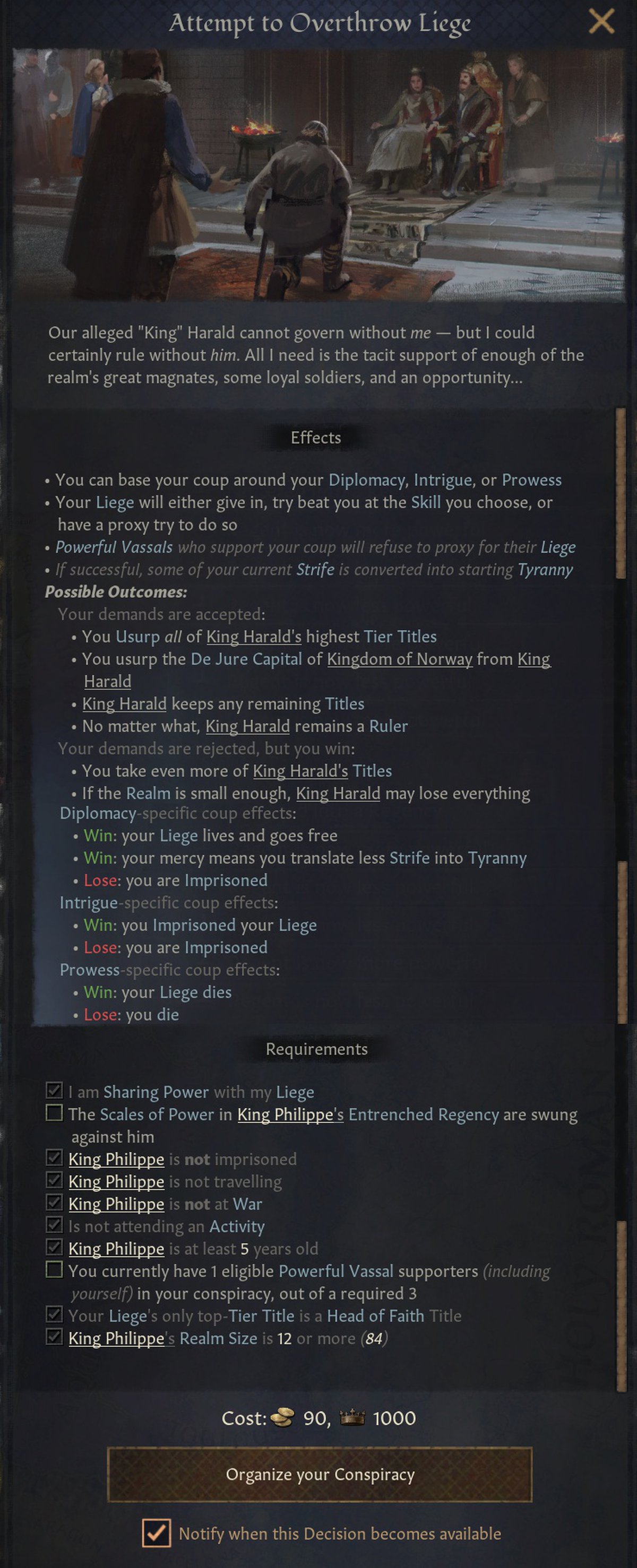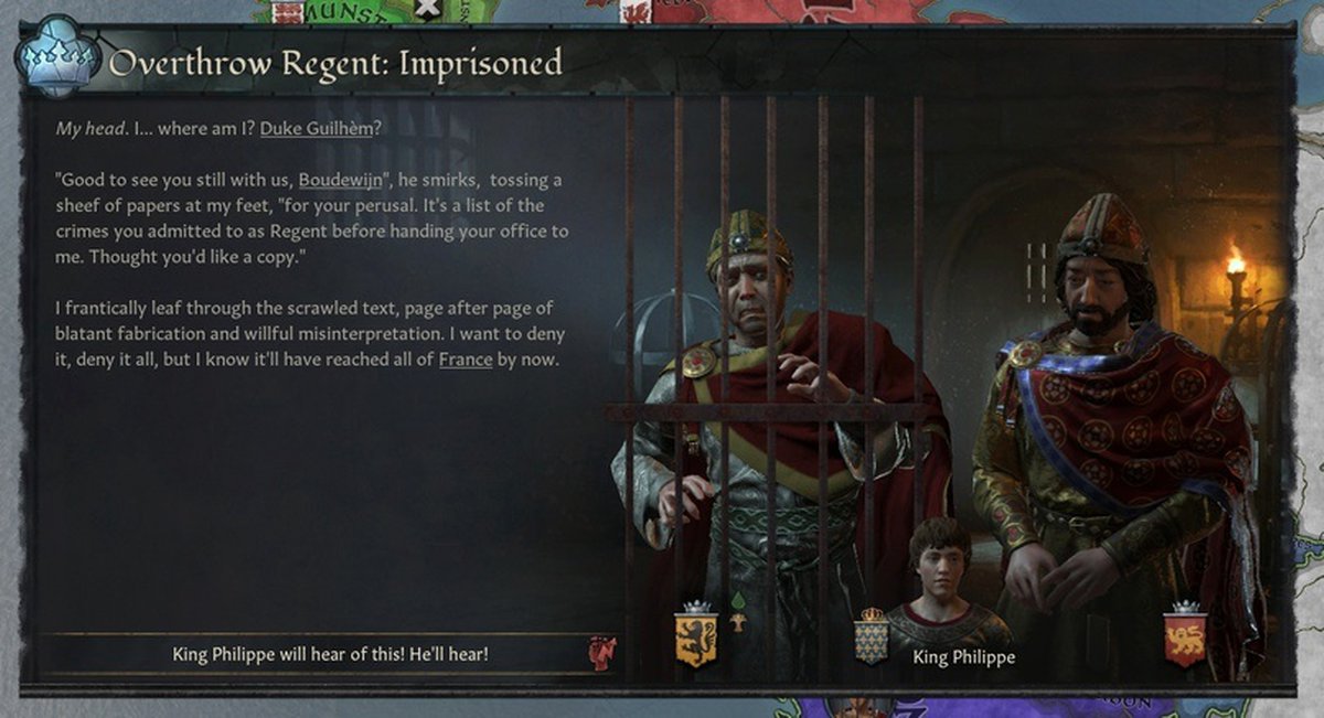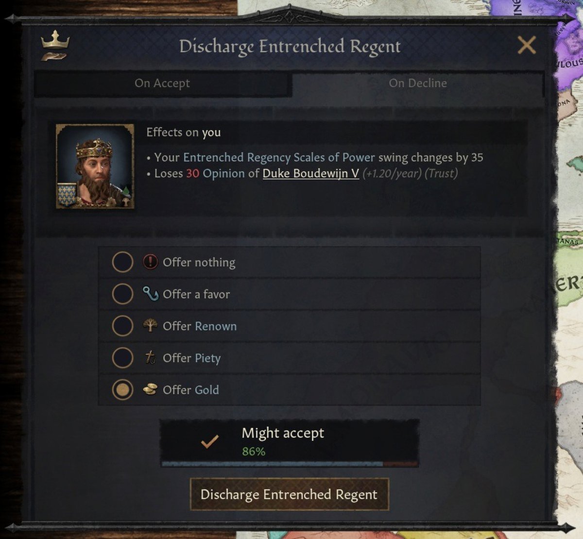 В определённый момент, регента нельзя будет сместить. Если правитель несовершеннолетний или недееспособный, регент укоренится сразу. Но даже в других случаях есть шанс такого исхода. Например, если король задержится в паломничестве по каким-то причинам.