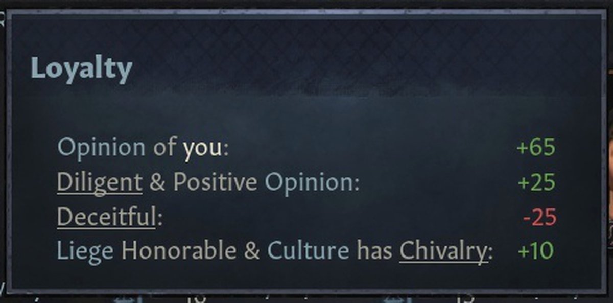 Казалось бы, под портретами персонажей есть число, показывающее мнение о герое игрока. Значит, если оно большое и зелёное, то бояться переворота не стоит? Нет, всё несколько сложнее. Лояльность будет зависеть от разных факторов: навыков, отношений, культурных традиций и придворных должностей.
