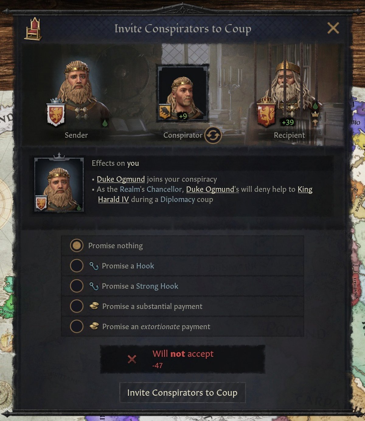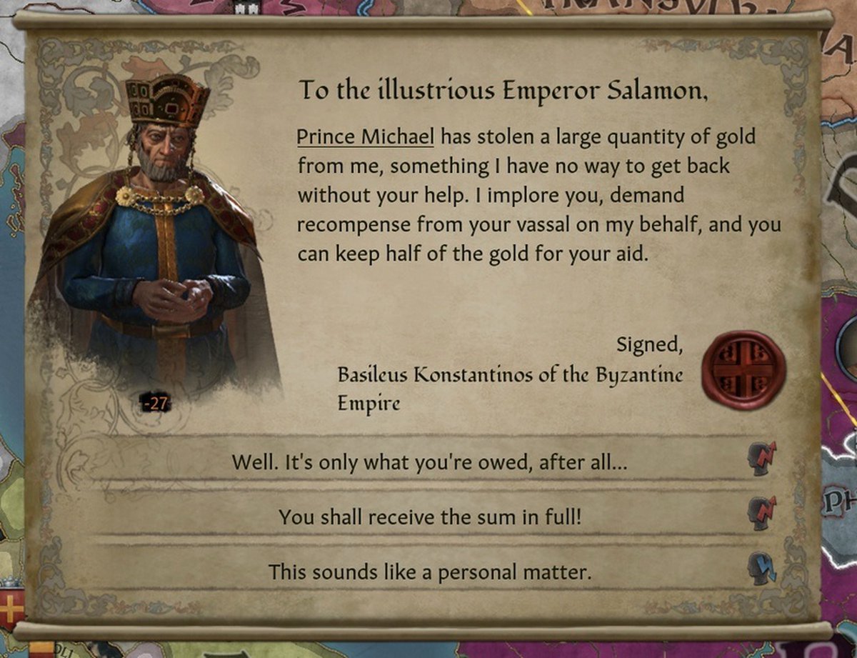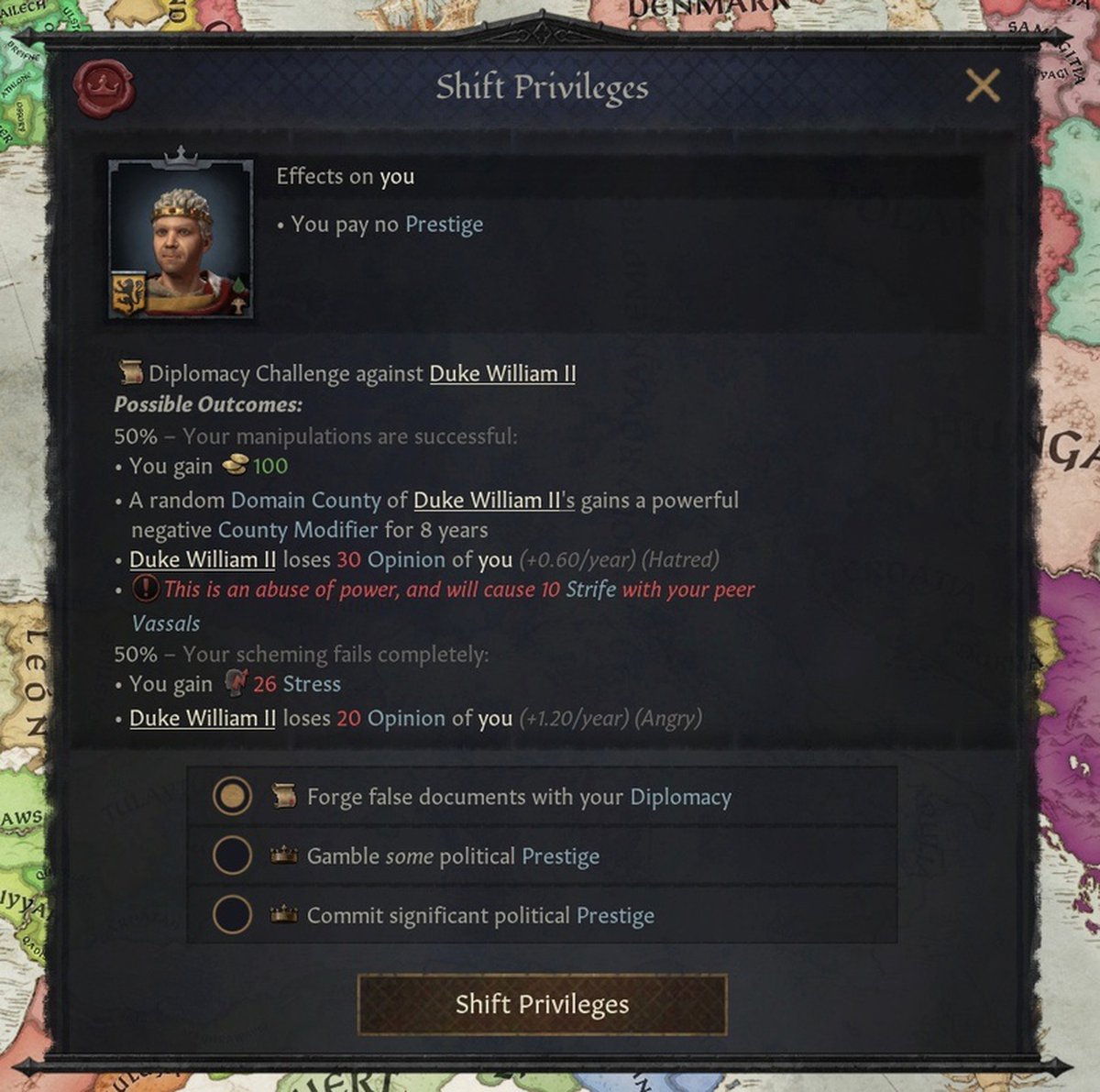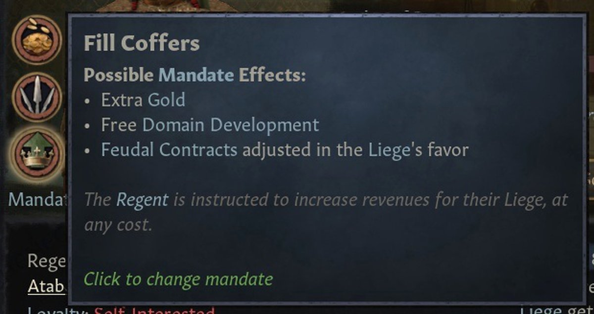 Будет у регента ещё одна схема. С помощью навыка дипломатии или престижа он сможет попытаться ограбить одного из вассалов, сам регент получит деньги, а вассалу на графство повесится дебафф.