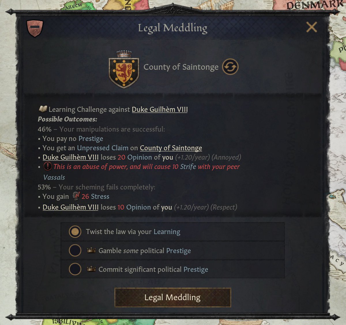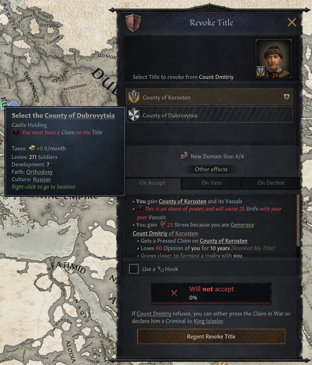 Также регент может попытаться получить претензии на какие-то земли во владениях правителя. У него есть варианты попытаться сделать это с помощью навыка учёности или за престиж.