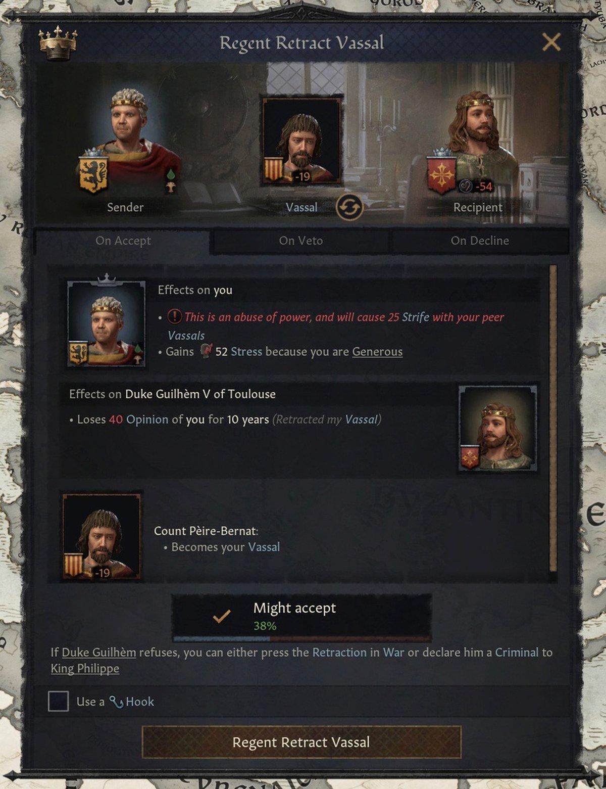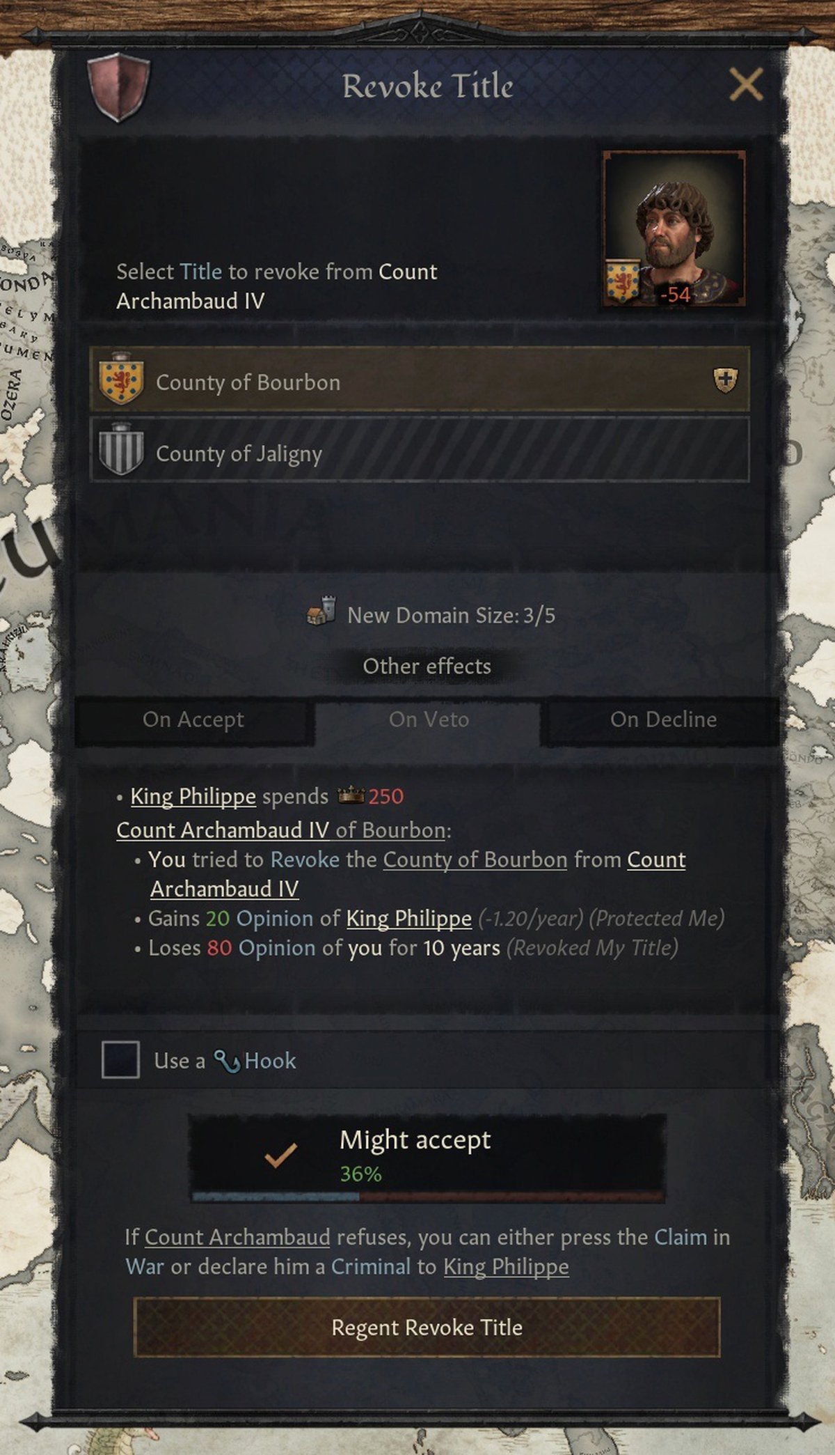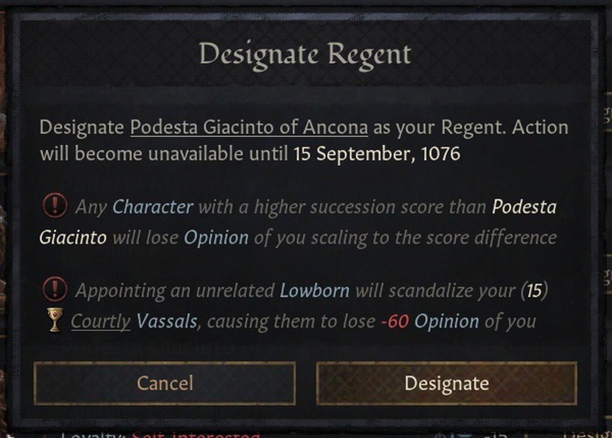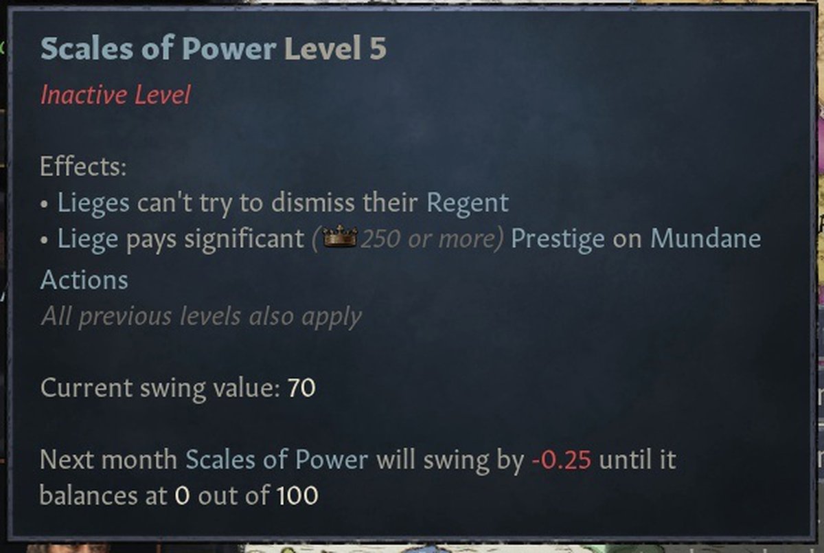 На каком-то уровне шкалы у уже укоренившегося регента появится возможность предложить у какого-то вассала титул забрать землю себе. У сюзерена есть право наложить вето ценой престижа.