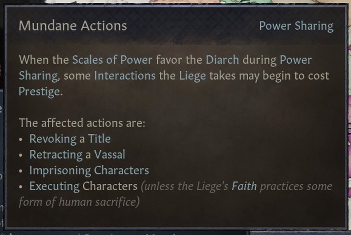 На определённом уровне у правителя появляется неудобство. Действия вроде отбирания титулов, заключение персонажей в тюрьму или казни теперь потребуют траты престижа. Хотя в конфессиях, где разрешено приношение людей в жертву, всё ещё убивать людей можно будет бесплатно.