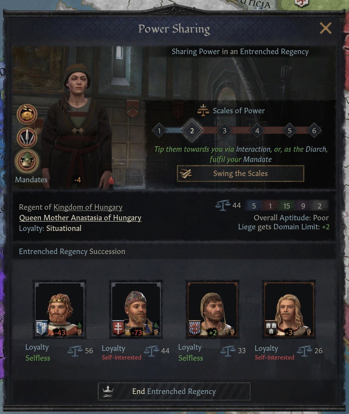 В случае возникновения регента появится показатель, отражающий баланс сил между ним и правителем. Чем выше уровень этой шкалы, тем больше регент заручается поддержкой аристократии, духовенства, придворных и получает рычаги власти.