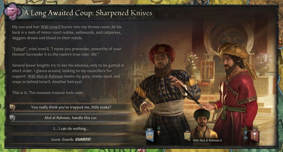 Сам переворот представляет собой поединок. Регент выбирает навык, по которому будут идти проверки: дипломатия, интриги или доблесть. Стоит понимать, что, если советник, соответствующий этому навыку не на стороне заговорщиков, правитель его позовёт на защиту.