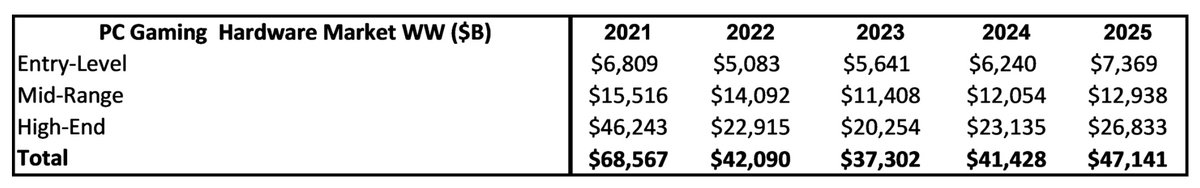 В 2023 году рынок игровых PC просядет почти вдвое по сравнению с 2021 годом: с $68.5 миллиарда до $37.3 миллиарда. Но уже в 2024 году объем рынка составит $41.4 миллиарда, а в 2025 году он вырастет до $47.1 миллиарда.