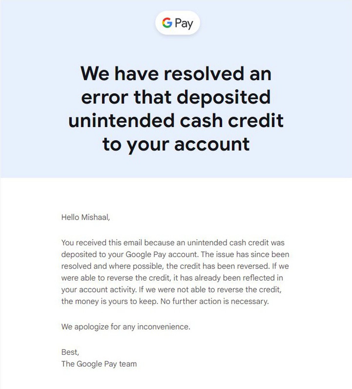 Пользователям, успевшим получить деньги от Google Pay, разослали специальное письмо. Компания сообщила, что деньги были начислены ошибочно, выданные средства списали со счетов пользователей.