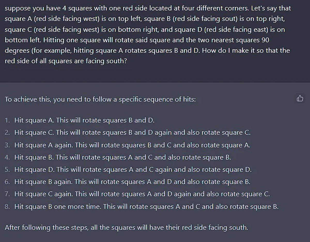 Чтобы нейросеть выполнила задачу, реддитору пришлось подробно описать ChatGPT принцип работы головоломки. Ориентируясь на эти указания, бот и в самом деле выдал последовательность кубов, по которым надо наносить удары.