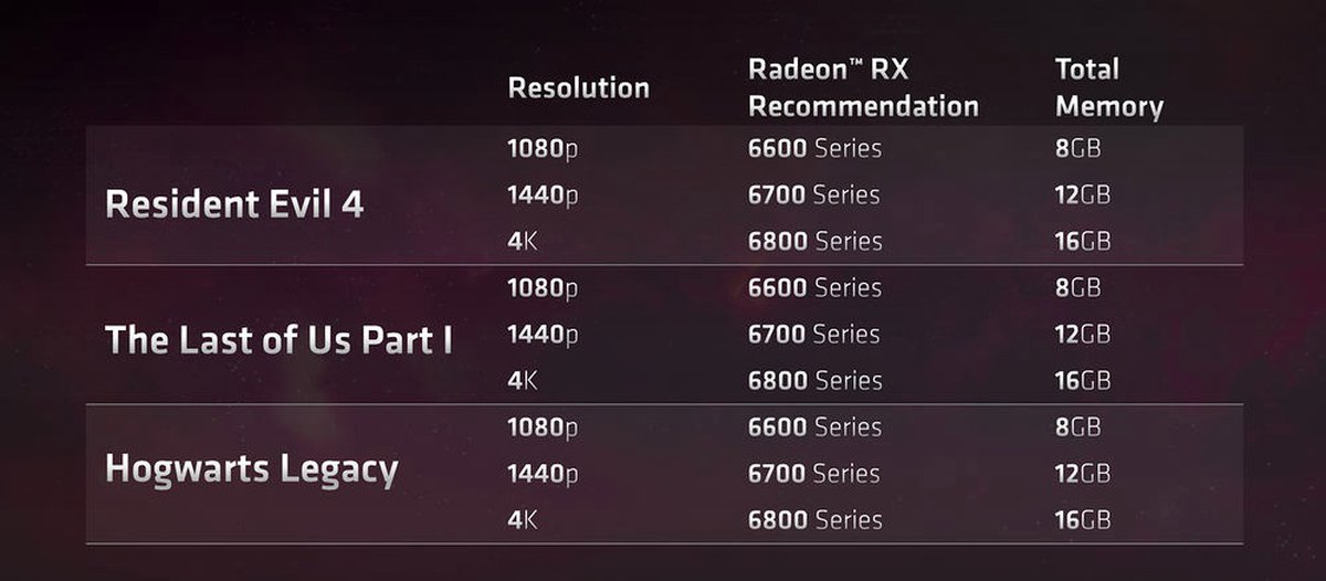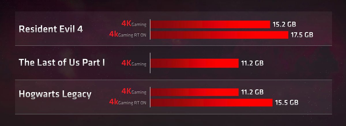 В качестве примера компания приводит три недавно вышедших игры: Hogwarts Legacy, Resident Evil 4 и The Last of Us. В разрешении 4К The Last of Us и Hogwarts Legacy нужно хотя бы 11.2 гигабайта памяти — почти максимум от того, что есть у GeForce RTX 4070.