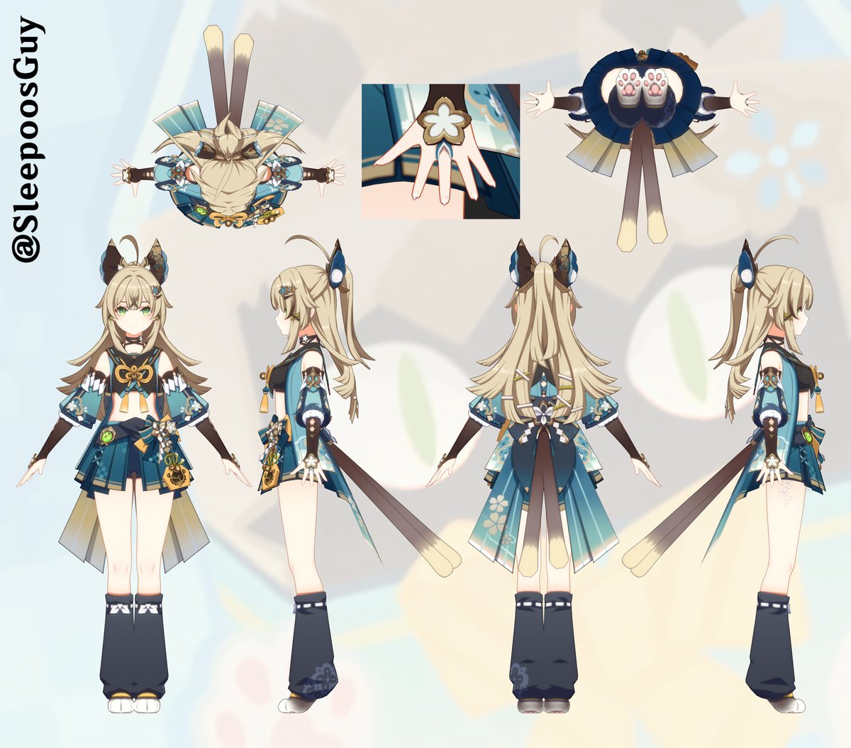 - Выше показан сплэш-арт Кирары, а ниже модель персонажа продемонстрирована со всех сторон. У Кирары и в самом деле розовые подушечки на лапках.