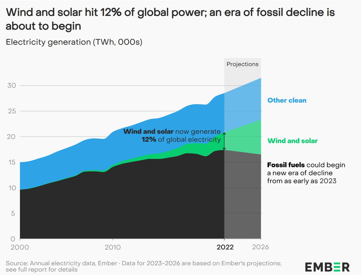 Согласно подсчетам Ember, в 2022 году чистые источники энергии (Солнце, ветер, атомная энергетика, геотермальная и гидроэнергия) дали 39% мировой электрогенерации.
