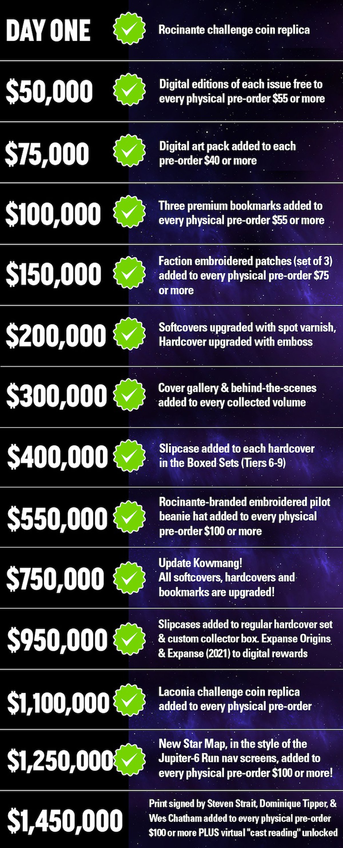 Ещё была кампания на Kickstarter, связанная с комиксом. Удалось собрать 1.405.859$. За достижение разных сумм обещали сделать всякие бонусы в основном тем, кто комикс предзакажет как в физическом, так и цифровом издании.