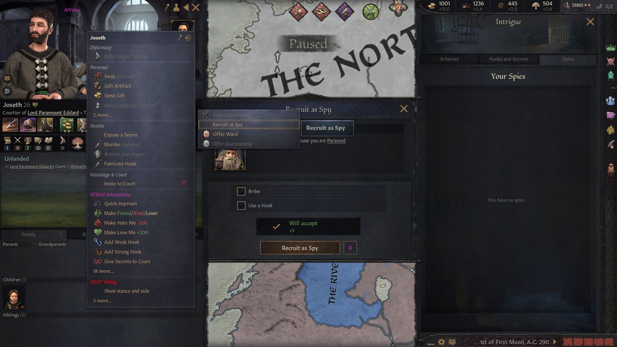 Оказывается, есть механика шпионских сетей. Для её использования надо вербовать шпионов в чужих дворах. Они будут сообщать персонажу разные секреты.